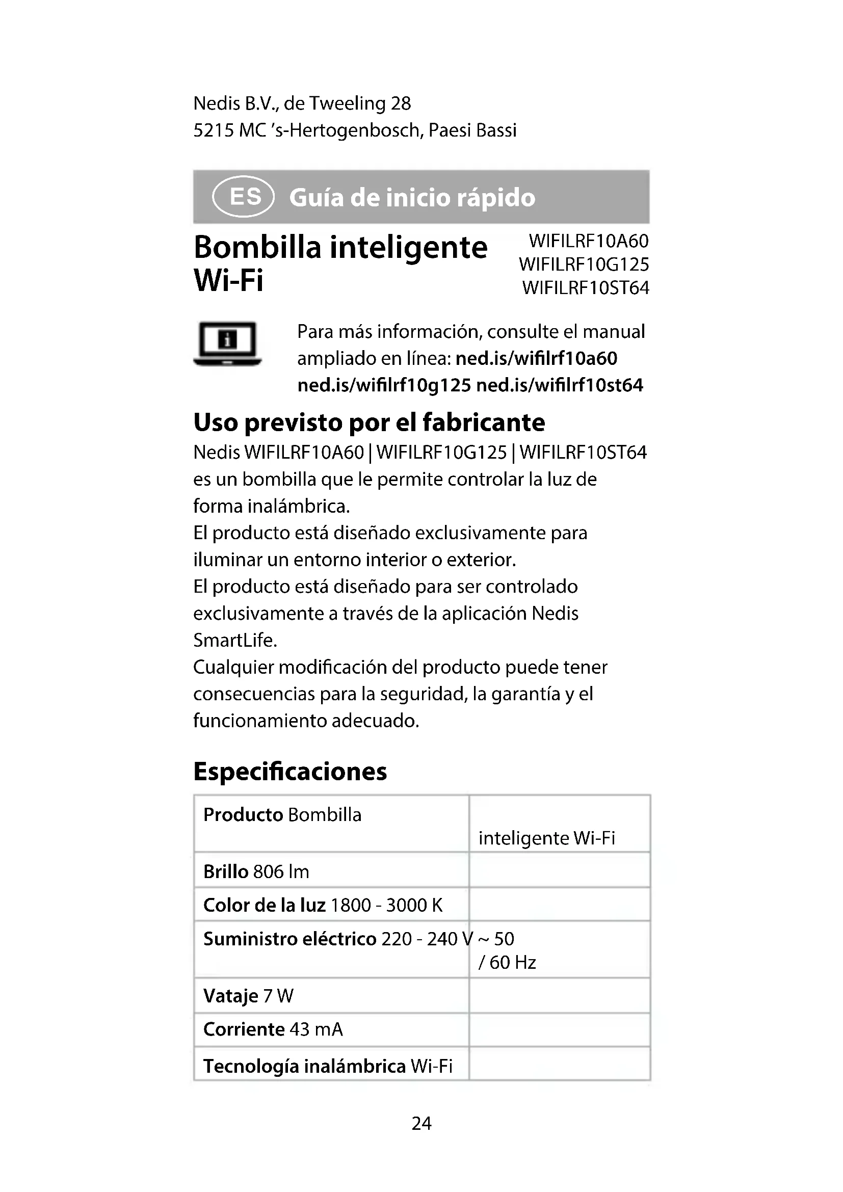 Guía de inicio rápido Bombilla inteligente Wi-Fi WIFILRF10A60 WIFILRF10G125 WIFILRF10ST64 Para más información, consulte el manual ampliado en línea: ned.is/wilrf10a60 ned.is/wilrf10g125 ned.is/wilrf10st64 Uso previsto por el fabricante Nedis WIFILRF10A60 | WIFILRF10G125 | WIFILRF10ST64 es un bombilla que le permite controlar la luz de forma inalámbrica. El producto está diseñado exclusivamente para iluminar un entorno interior o exterior. El producto está diseñado para ser controlado exclusivamente a través de la aplicación Nedis SmartLife. Cualquier modicación del producto puede tener consecuencias para la seguridad, la garantía y el funcionamiento adecuado. Especicaciones Producto Bombilla inteligente Wi-Fi Brillo 806 lm Color de la luz 1800 - 3000 K Suministro eléctrico 220 - 240 V ~ 50 / 60 Hz Vataje 7 W Corriente 43 mA Tecnología inalámbrica Wi-Fi25 Rango de frecuencia 2412 - 2472 MHz Potencia máx. de radiotransmisión 17 dBm Casquillo E27 Material Vidrio Número de artículo Dimensiones Peso WIFILRF10A60 Ø 60 x 105 mm 30 g WIFILRT10G125 Ø 125 x 172 mm 100 g WIFILRF10ST64 Ø 64 x 142 mm 46 g Partes principales (imagen A) 1 Bombilla 2 Filamento 3 Contacto eléctrico Instrucciones de seguridad