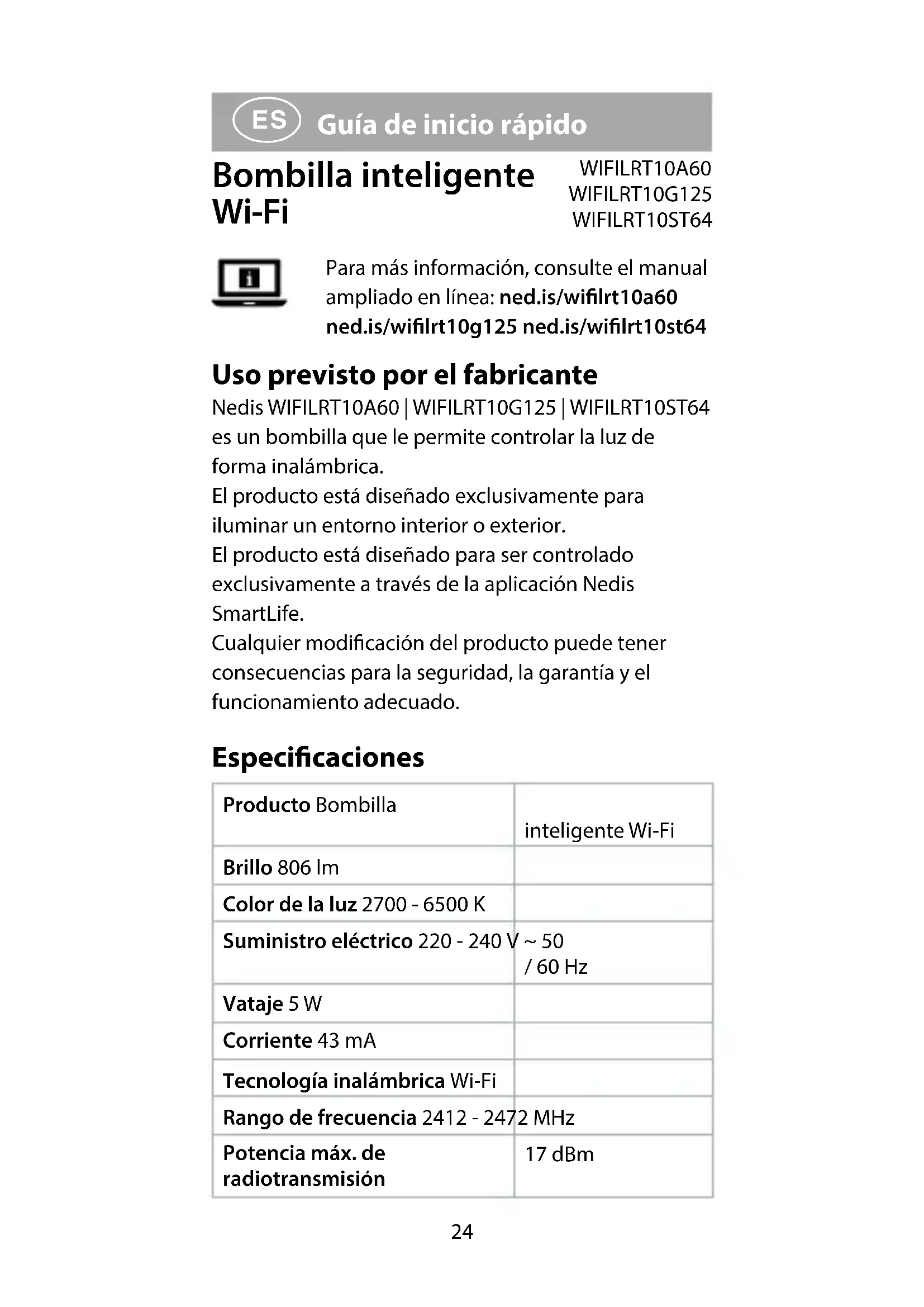 Guía de inicio rápido Bombilla inteligente Wi-Fi WIFILRT10A60 WIFILRT10G125 WIFILRT10ST64 Para más información, consulte el manual ampliado en línea: ned.is/wilrt10a60 ned.is/wilrt10g125 ned.is/wilrt10st64 Uso previsto por el fabricante Nedis WIFILRT10A60 | WIFILRT10G125 | WIFILRT10ST64 es un bombilla que le permite controlar la luz de forma inalámbrica. El producto está diseñado exclusivamente para iluminar un entorno interior o exterior. El producto está diseñado para ser controlado exclusivamente a través de la aplicación Nedis SmartLife. Cualquier modicación del producto puede tener consecuencias para la seguridad, la garantía y el funcionamiento adecuado. Especicaciones Producto Bombilla inteligente Wi-Fi Brillo 806 lm Color de la luz 2700 - 6500 K Suministro eléctrico 220 - 240 V ~ 50 / 60 Hz Vataje 5 W Corriente 43 mA Tecnología inalámbrica Wi-Fi Rango de frecuencia 2412 - 2472 MHz Potencia máx. de radiotransmisión 17 dBm25 Casquillo E27 Material Vidrio Número de artículo Dimensiones Peso WIFILRT10A60 Ø 60 x 105 mm 30 g WIFILRT10G125 Ø 125 x 172 mm 100 g WIFILRT10ST64 Ø 64 x 142 mm 46 g Partes principales (imagen A) 1 Bombilla 2 Filamento 3 Contacto eléctrico Instrucciones de seguridad