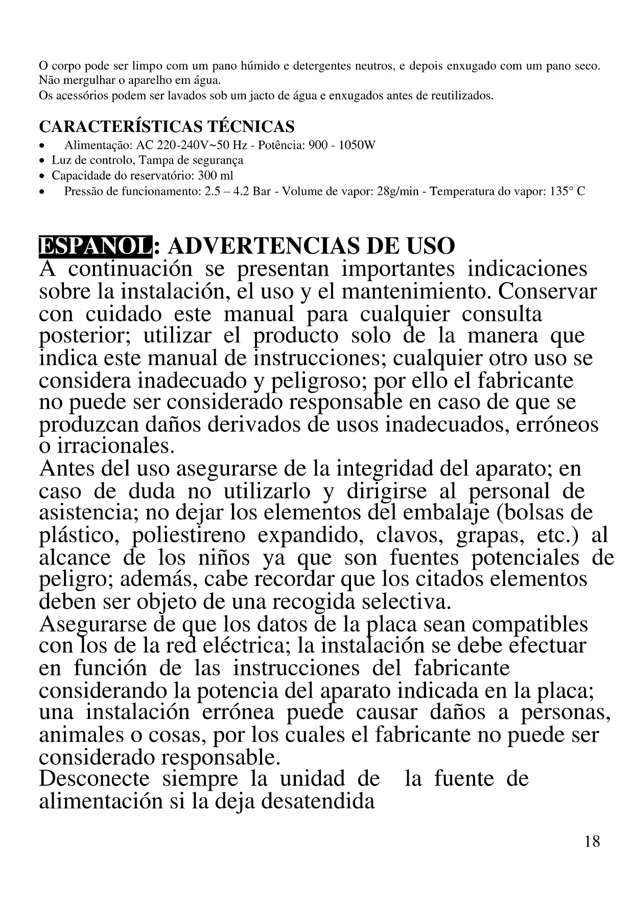 Cuando la presión de vapor decrece debemos rellenar el tanque. Desconecte el cable eléctrico. Presione el botón (4) hasta que todo el vapor haya salido. Presione el tapón (3) y desenrósquelo despacio, cuidado no se queme con el vapor que sale del tanque. Deje enfriar unos 5 minutos. Llene el tanque con agua utilizando el embudo y el vaso proporcionados. Finalmente asegure el tapón. LIMPIEZA PRECAUCION antes de limpiar ninguna parte del equipo desenchúfelo y déjelo enfriar. La parte principal puede ser limpiada con un paño húmedo y un detergente neutro y después pasar un paño seco. No sumerja el equipo en agua u otros líquidos. Los accesorios pueden ser limpiados directamente con agua del grifo y secados antes de re-ensamblar. CARACTERISTICAS TECNICAS