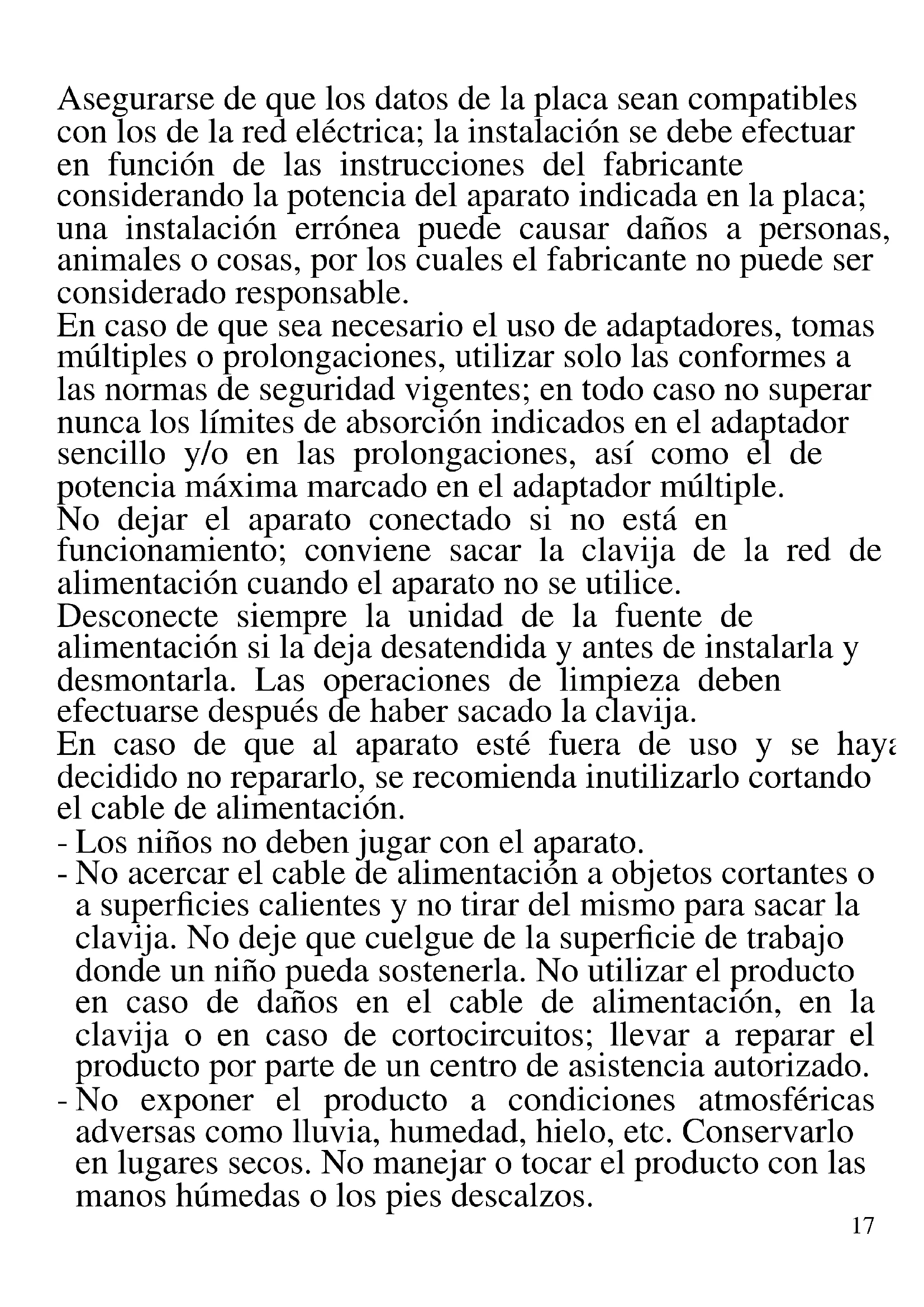 A continuación se presentan importantes indicaciones sobre la instalación, el uso y el mantenimiento. Conservar con cuidado este manual para cualquier consulta posterior; utilizar el producto solo de la manera que indica este manual de instrucciones; cualquier otro uso se considera inadecuado y peligroso; por ello el fabricante no puede ser considerado responsable en caso de que se produzcan daños derivados de usos inadecuados, erróneos o irracionales. Antes del uso asegurarse de la integridad del aparato; en caso de duda no utilizarlo y dirigirse al personal de asistencia; no dejar los elementos del embalaje (bolsas de plástico, poliestireno expandido, clavos, grapas, etc.) al alcance de los niños ya que son fuentes potenciales de peligro; además, cabe recordar que los citados elementos deben ser objeto de una recogida selectiva.17 Asegurarse de que los datos de la placa sean compatibles con los de la red eléctrica; la instalación se debe efectuar en función de las instrucciones del fabricante considerando la potencia del aparato indicada en la placa; una instalación errónea puede causar daños a personas, animales o cosas, por los cuales el fabricante no puede ser considerado responsable. En caso de que sea necesario el uso de adaptadores, tomas múltiples o prolongaciones, utilizar solo las conformes a las normas de seguridad vigentes; en todo caso no superar nunca los límites de absorción indicados en el adaptador sencillo y/o en las prolongaciones, así como el de potencia máxima marcado en el adaptador múltiple. No dejar el aparato conectado si no está en funcionamiento; conviene sacar la clavija de la red de alimentación cuando el aparato no se utilice. Desconecte siempre la unidad de la fuente de alimentación si la deja desatendida y antes de instalarla y desmontarla. Las operaciones de limpieza deben efectuarse después de haber sacado la clavija. En caso de que al aparato esté fuera de uso y se haya decidido no repararlo, se recomienda inutilizarlo cortando el cable de alimentación. - Los niños no deben jugar con el aparato. - No acercar el cable de alimentación a objetos cortantes o a superficies calientes y no tirar del mismo para sacar la clavija. No deje que cuelgue de la superficie de trabajo donde un niño pueda sostenerla. No utilizar el producto en caso de daños en el cable de alimentación, en la clavija o en caso de cortocircuitos; llevar a reparar el producto por parte de un centro de asistencia autorizado. - No exponer el producto a condiciones atmosféricas adversas como lluvia, humedad, hielo, etc. Conservarlo en lugares secos. No manejar o tocar el producto con las manos húmedas o los pies descalzos.18 - Este aparato puede ser utilizado por niños a partir de 8 años y por personas con capacidades físicas, sensoriales o mentales reducidas o con falta de experiencia o conocimiento si a dichas personas se ha asegurado una supervisión adecuada o bien si han recibido instrucciones sobre el uso seguro del aparato; las operaciones de limpieza y de mantenimiento no deben ser efectuadas por niños a no ser que tengan más de 8 años y estén supervisados. - Mantener el producto y el cable fuera del alcance de los niños menores de 8 años. - No apto para uso comercial. Solo para uso doméstico En caso de avería y/o de funcionamiento anómalo no manipular el aparato. Para una posible reparación, dirigirse únicamente a un centro autorizado por el fabricante y solicitar el uso de recambios originales. El incumplimiento de lo indicado puede comprometer la seguridad del aparato y anular la garantía. Este aparato está diseñado para uso doméstico o similares: cocinas para el personal de tiendas, oficinas u otros centros de trabajo, para clientes de hoteles, moteles, hostales y similares. Antes de cada uso, desenrolle el cable de alimentación. El aparato no está diseñado para su uso a través de temporizadores externos o mandos a distancia. Utilice únicamente piezas de repuesto y accesorios originales. No someta el producto a impactos fuertes se producirán daños serios. Mantenga la unidad lejos de materiales inflamables, calor, puntos fríos y vapor.