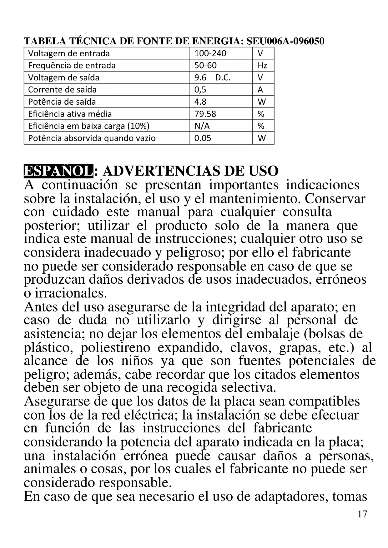A continuación se presentan importantes indicaciones sobre la instalación, el uso y el mantenimiento. Conservar con cuidado este manual para cualquier consulta posterior; utilizar el producto solo de la manera que indica este manual de instrucciones; cualquier otro uso se considera inadecuado y peligroso; por ello el fabricante no puede ser considerado responsable en caso de que se produzcan daños derivados de usos inadecuados, erróneos o irracionales. Antes del uso asegurarse de la integridad del aparato; en caso de duda no utilizarlo y dirigirse al personal de asistencia; no dejar los elementos del embalaje (bolsas de plástico, poliestireno expandido, clavos, grapas, etc.) al alcance de los niños ya que son fuentes potenciales de peligro; además, cabe recordar que los citados elementos deben ser objeto de una recogida selectiva. Asegurarse de que los datos de la placa sean compatibles con los de la red eléctrica; la instalación se debe efectuar en función de las instrucciones del fabricante considerando la potencia del aparato indicada en la placa; una instalación errónea puede causar daños a personas, animales o cosas, por los cuales el fabricante no puede ser considerado responsable. En caso de que sea necesario el uso de adaptadores, tomas Voltagem de entrada 100-240