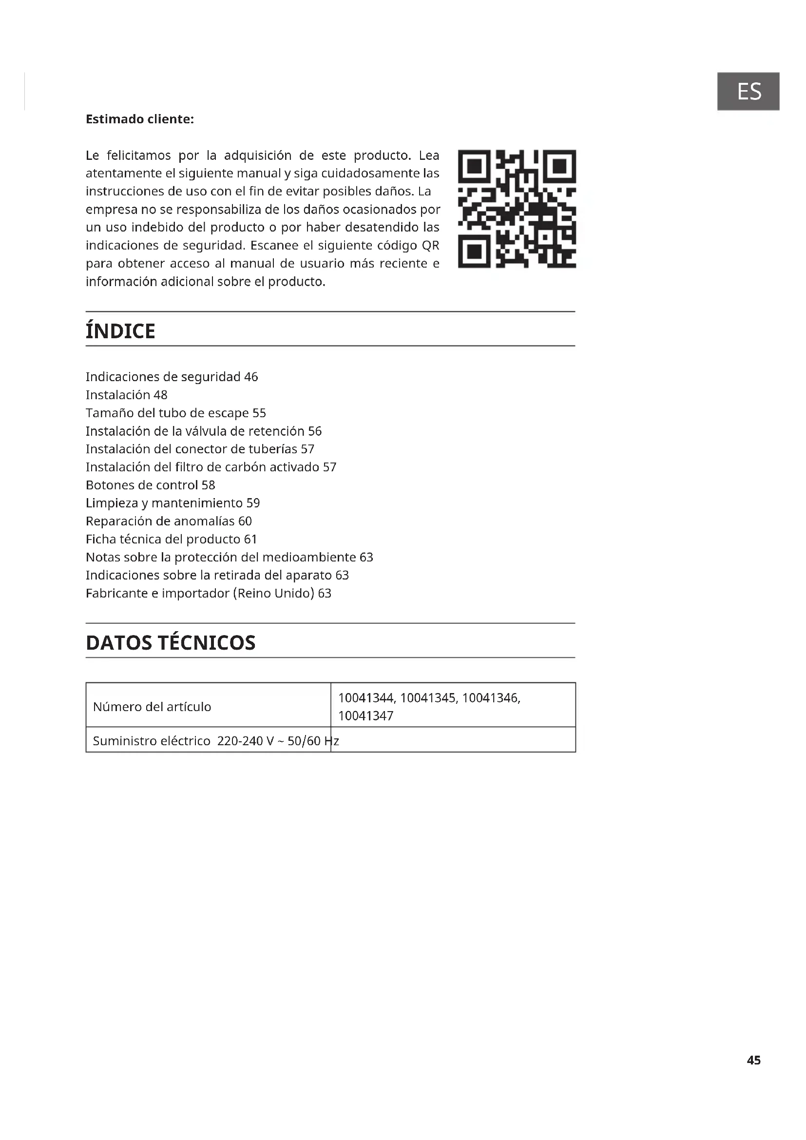 Estimado cliente: Le felicitamos por la adquisición de este producto. Lea atentamente el siguiente manual y siga cuidadosamente las instrucciones de uso con el n de evitar posibles daños. La empresa no se responsabiliza de los daños ocasionados por un uso indebido del producto o por haber desatendido las indicaciones de seguridad. Escanee el siguiente código QR para obtener acceso al manual de usuario más reciente e información adicional sobre el producto. ÍNDICE Indicaciones de seguridad 46 Instalación 48 Tamaño del tubo de escape 55 Instalación de la válvula de retención 56 Instalación del conector de tuberías 57 Instalación del ltro de carbón activado 57 Botones de control 58 Limpieza y mantenimiento 59 Reparación de anomalías 60 Ficha técnica del producto 61 Notas sobre la protección del medioambiente 63 Indicaciones sobre la retirada del aparato 63 Fabricante e importador (Reino Unido) 63