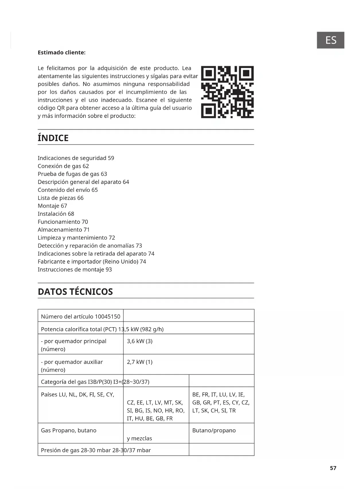 Estimado cliente: Le felicitamos por la adquisición de este producto. Lea atentamente las siguientes instrucciones y sígalas para evitar posibles daños. No asumimos ninguna responsabilidad por los daños causados por el incumplimiento de las instrucciones y el uso inadecuado. Escanee el siguiente código QR para obtener acceso a la última guía del usuario y más información sobre el producto: ÍNDICE Indicaciones de seguridad 59 Conexión de gas 62 Prueba de fugas de gas 63 Descripción general del aparato 64 Contenido del envío 65 Lista de piezas 66 Montaje 67 Instalación 68 Funcionamiento 70 Almacenamiento 71 Limpieza y mantenimiento 72 Detección y reparación de anomalías 73 Indicaciones sobre la retirada del aparato 74 Fabricante e importador (Reino Unido) 74 Instrucciones de montaje 93