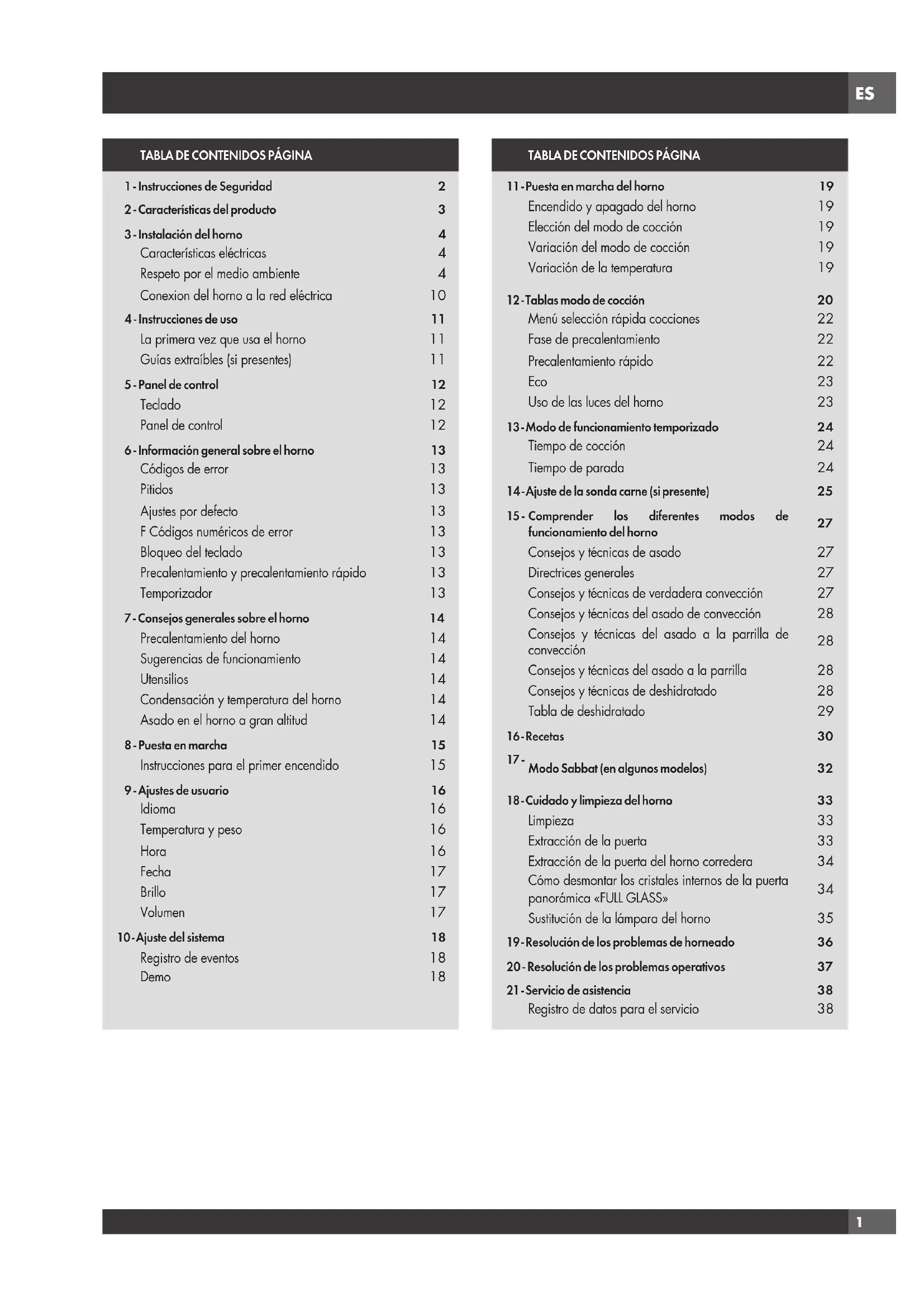 Antes de llamar al servicio verifique los siguientes puntos para evitar sobrecargarlo de forma innecesaria. Problema del horno Pasos para resolver el problema En la ventana aparece otro F_Error. Apague la corriente general y vuelva a encenderla pasados unos segundos. Si la condición persiste anote el número de código (en la lista REGISTRO EVENTO) y póngase en contacto con el servicio. El display del horno permanece en OFF Apague la corriente general (caja de fusibles o cortocircuito). Encienda el disyuntor. Si la condición persiste llame al servicio de asistencia autorizado. El ventilador de enfriamiento sigue funcionando después de haberlo apagado. El ventilador se apaga automáticamente cuando todos los componentes electrónicos se han enfriado bastante. El horno no está calentando. Verifique el disyuntor de circuito o la caja de fusibles. Asegúrese de que el horno recibe una alimentación eléctrica adecuada. Asegúrese de que se ha seleccionado la temperatura del horno. El horno no cuece de manera uniforme Consulte las tablas del horno para averiguar cuál es la posición recomendada de la rejilla. Reducir siempre la temperatura de la receta 25°F (15°C) cuando se cuece en modo horneado convección. La luz del horno no funciona correctamente Cambie o vuelva a poner la bombilla si está floja o si es defectuosa. Consulte la página 35. Procure no tocar el cristal de la bombilla con los dedos, dado que la grasa de estos puede causar que la bombilla se queme prematuramente. La luz del horno se queda encendida Verifique si la puerta del horno está obstruida Verifique si la bisagra está doblada o si se ha roto el interruptor de la puerta. El reloj y el temporizador no funcionan adecuadamente Asegúrese de que el horno recibe una alimentación eléctrica adecuada. Consulte las secciones reloj en la página 16. Exceso de humedad Caliente previamente el horno cuando use el modo horneado. El horneado y el asado de convección eliminarán toda la humedad del horno (es una de las ventajas de la convección). Esquirlas de porcelana Cuando se sacan y se cambian las rejillas del horno tire siempre de estas hacia arriba sin forzarlas para evitar que la porcelana se desmenuce.ES