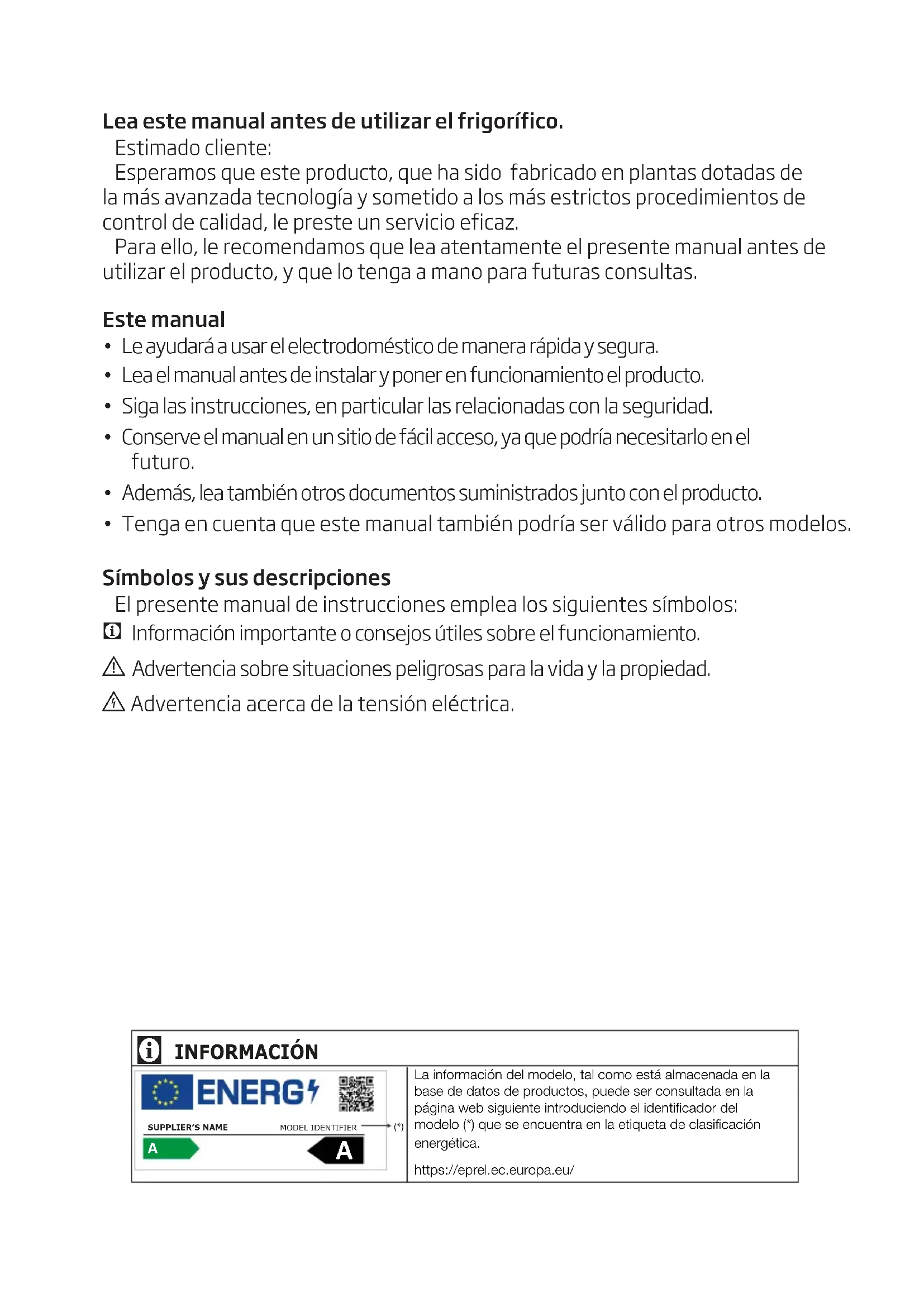 La información del modelo, tal como está almacenada en la base de datos de productos, puede ser consultada en la página web siguiente introduciendo el identificador del modelo (*) que se encuentra en la etiqueta de clasificación energética.https://eprel.ec.europa.eu/