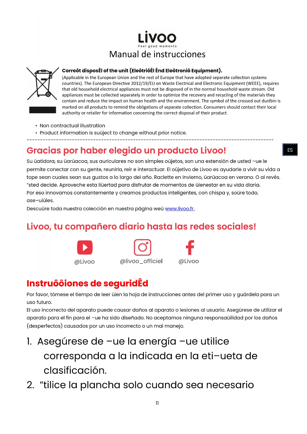 Gracias por haber elegido un producto Livoo! Su batidora, su barbacoa, sus auriculares no son simples objetos, son una extensión de usted que le permite conectar con su gente, reunirla, reír e interactuar. El objetivo de Livoo es ayudarle a vivir su vida a tope sean cuales sean sus gustos a lo largo del año. Raclette en invierno, barbacoa en verano. O al revés. Usted decide. Aproveche esta libertad para disfrutar de momentos de bienestar en su vida diaria. Por eso innovamos constantemente y creamos productos inteligentes, con chispa y, sobre todo, asequibles. Descubre toda nuestra colección en nuestra página web www.livoo.fr. Livoo, tu compañero diario hasta las redes sociales!