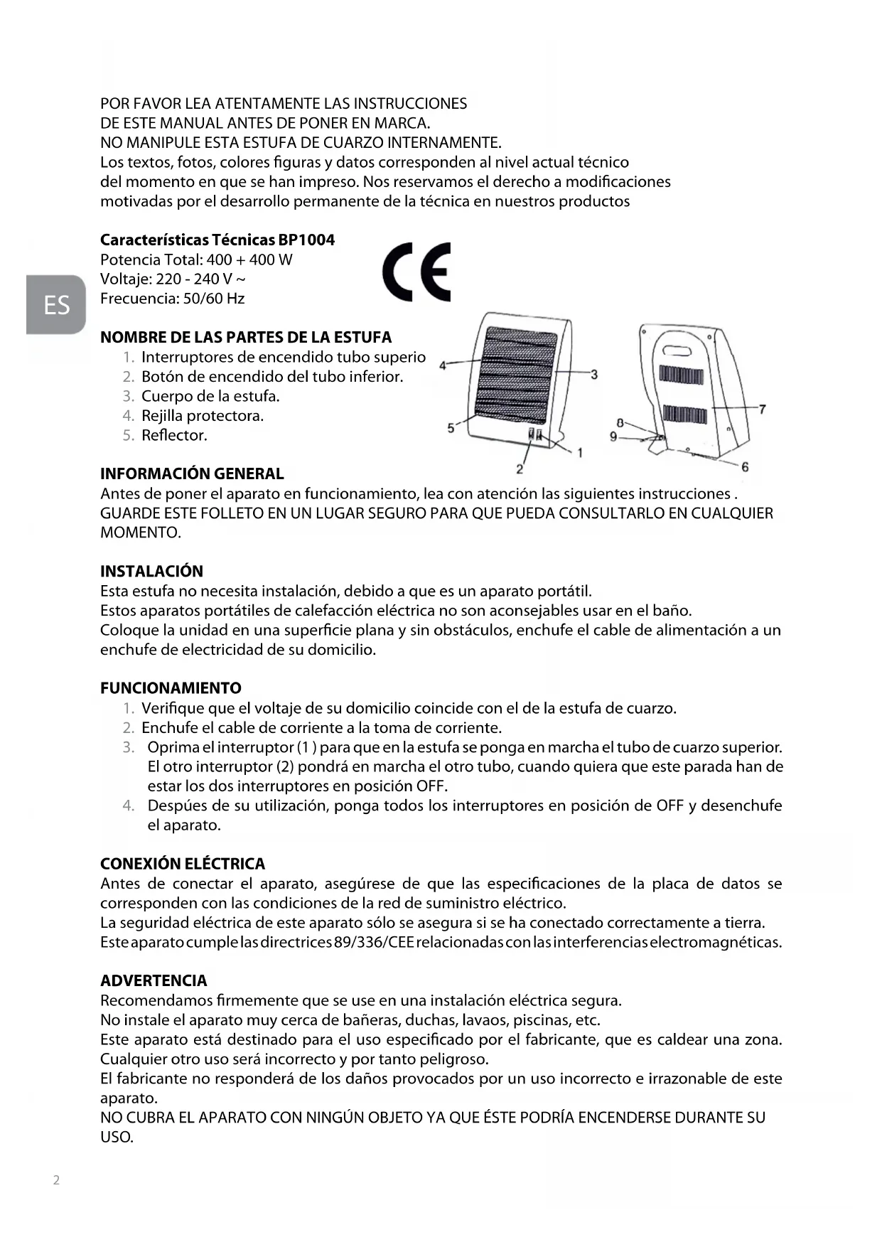 DE ESTE MANUAL ANTES DE PONER EN MARCA. NO MANIPULE ESTA ESTUFA DE CUARZO INTERNAMENTE. Los textos, fotos, colores guras y datos corresponden al nivel actual técnico del momento en que se han impreso. Nos reservamos el derecho a modicaciones motivadas por el desarrollo permanente de la técnica en nuestros productos Características Técnicas BP1004 Potencia Total: 400 + 400 W Voltaje: 220 - 240 V ~ Frecuencia: 50/60 Hz NOMBRE DE LAS PARTES DE LA ESTUFA