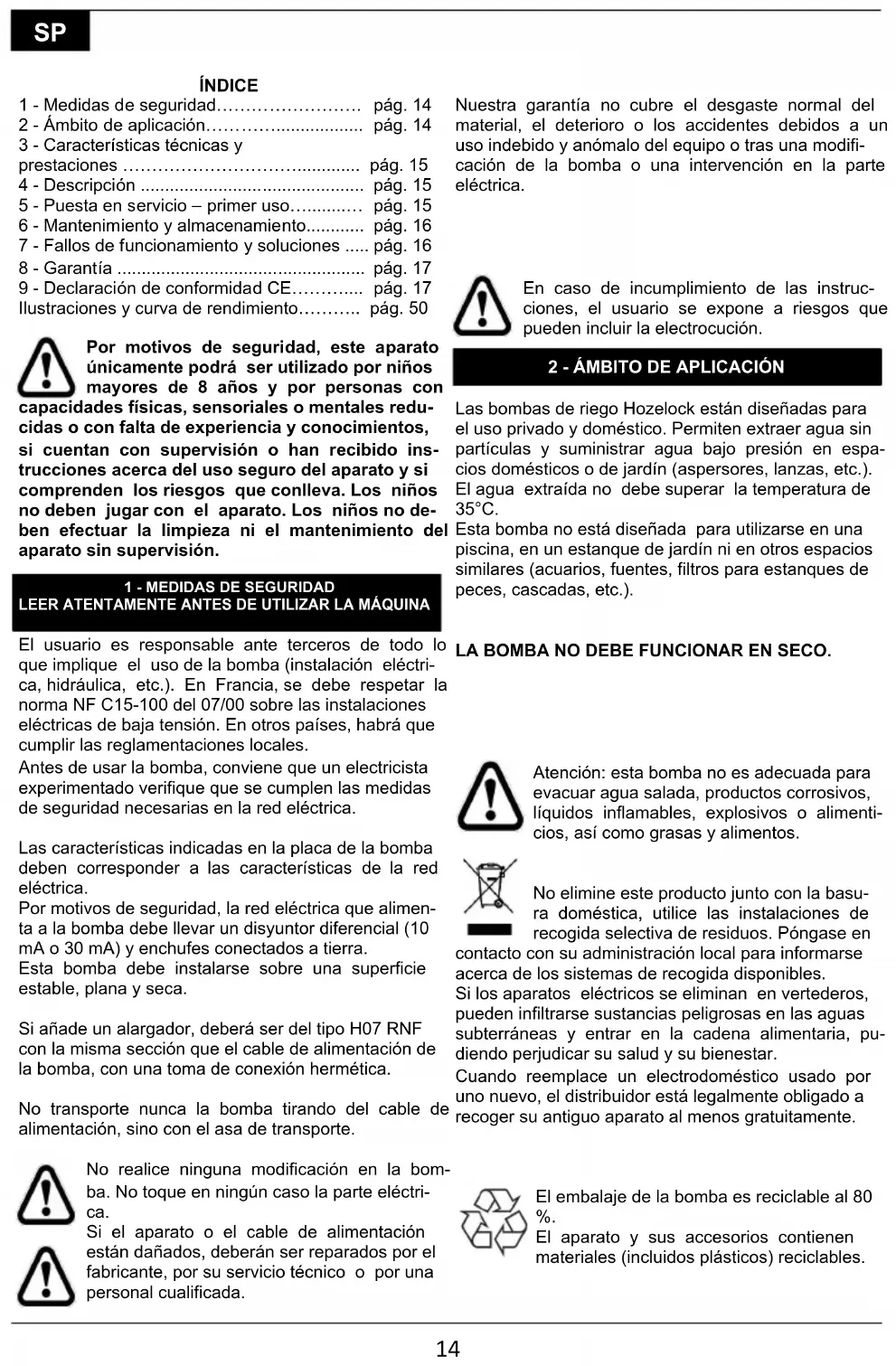 LEER ATENTAMENTE ANTES DE UTILIZAR LA MÁQUINA El usuario es responsable ante terceros de todo lo que implique el uso de la bomba (instalación eléctri- ca, hidráulica, etc.). En Francia, se debe respetar la norma NF C15-100 del 07/00 sobre las instalaciones eléctricas de baja tensión. En otros países, habrá que cumplir las reglamentaciones locales. Antes de usar la bomba, conviene que un electricista experimentado verifique que se cumplen las medidas de seguridad necesarias en la red eléctrica. Las características indicadas en la placa de la bomba deben corresponder a las características de la red eléctrica. Por motivos de seguridad, la red eléctrica que alimen- ta a la bomba debe llevar un disyuntor diferencial (10 mA o 30 mA) y enchufes conectados a tierra. Esta bomba debe instalarse sobre una superficie estable, plana y seca. Si añade un alargador, deberá ser del tipo H07 RNF con la misma sección que el cable de alimentación de la bomba, con una toma de conexión hermética. No transporte nunca la bomba tirando del cable de alimentación, sino con el asa de transporte. No realice ninguna modificación en la bom- ba. No toque en ningún caso la parte eléctri- ca. Si el aparato o el cable de alimentación están dañados, deberán ser reparados por el fabricante, por su servicio técnico o por una personal cualificada. Nuestra garantía no cubre el desgaste normal del material, el deterioro o los accidentes debidos a un uso indebido y anómalo del equipo o tras una modifi- cación de la bomba o una intervención en la parte eléctrica.