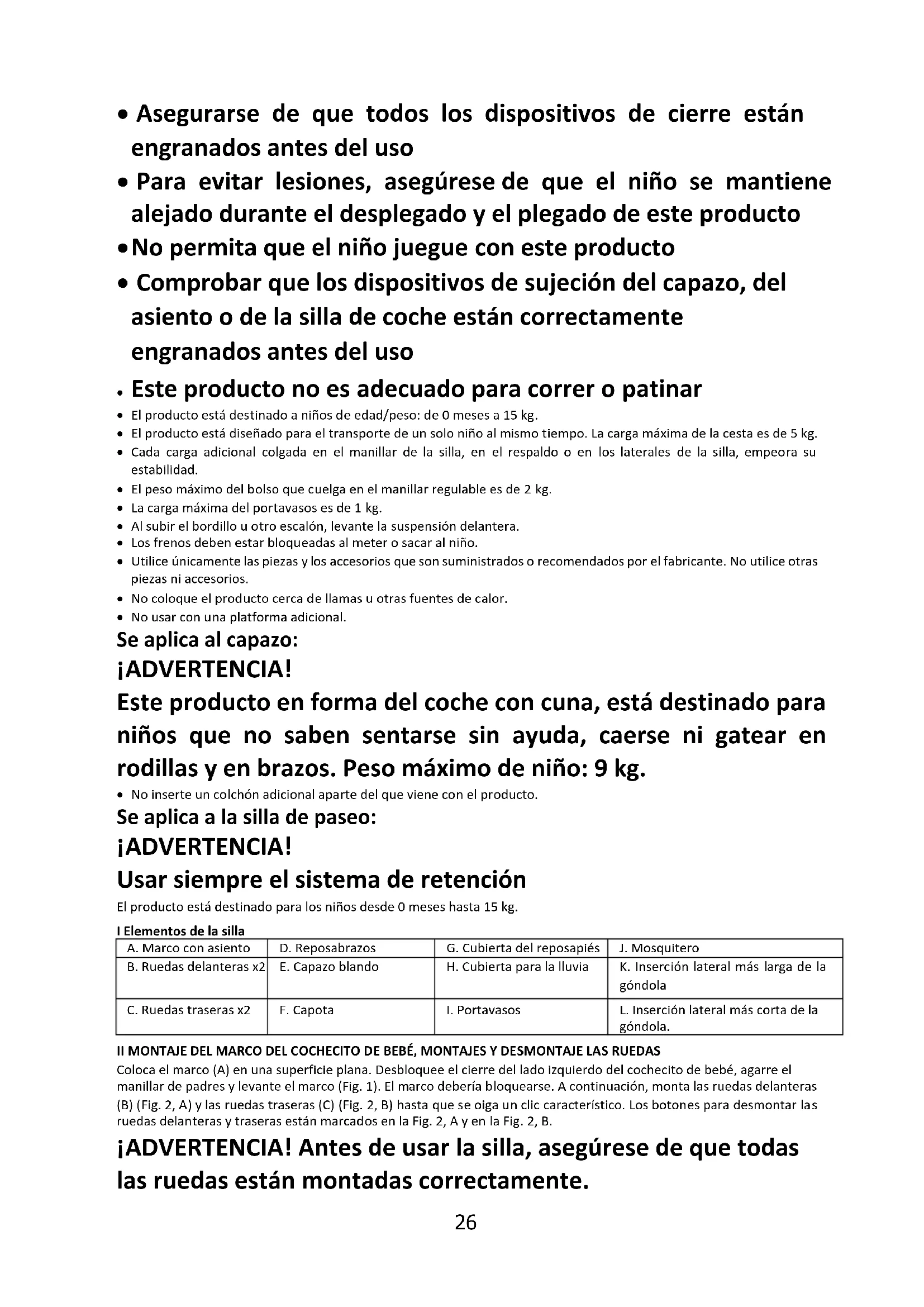 - No inserte un colchón adicional aparte del que viene con el producto. Se aplica a la silla de paseo: ¡ADVERTENCIA! Usar siempre el sistema de retención El producto está destinado para los niños desde 0 meses hasta 15 kg. I Elementos de la silla A. Marco con asiento D. Reposabrazos G. Cubierta del reposapiés J. Mosquitero B. Ruedas delanteras x2 E. Capazo blando H. Cubierta para la lluvia K. Inserción lateral más larga de la góndola C. Ruedas traseras x2 F. Capota