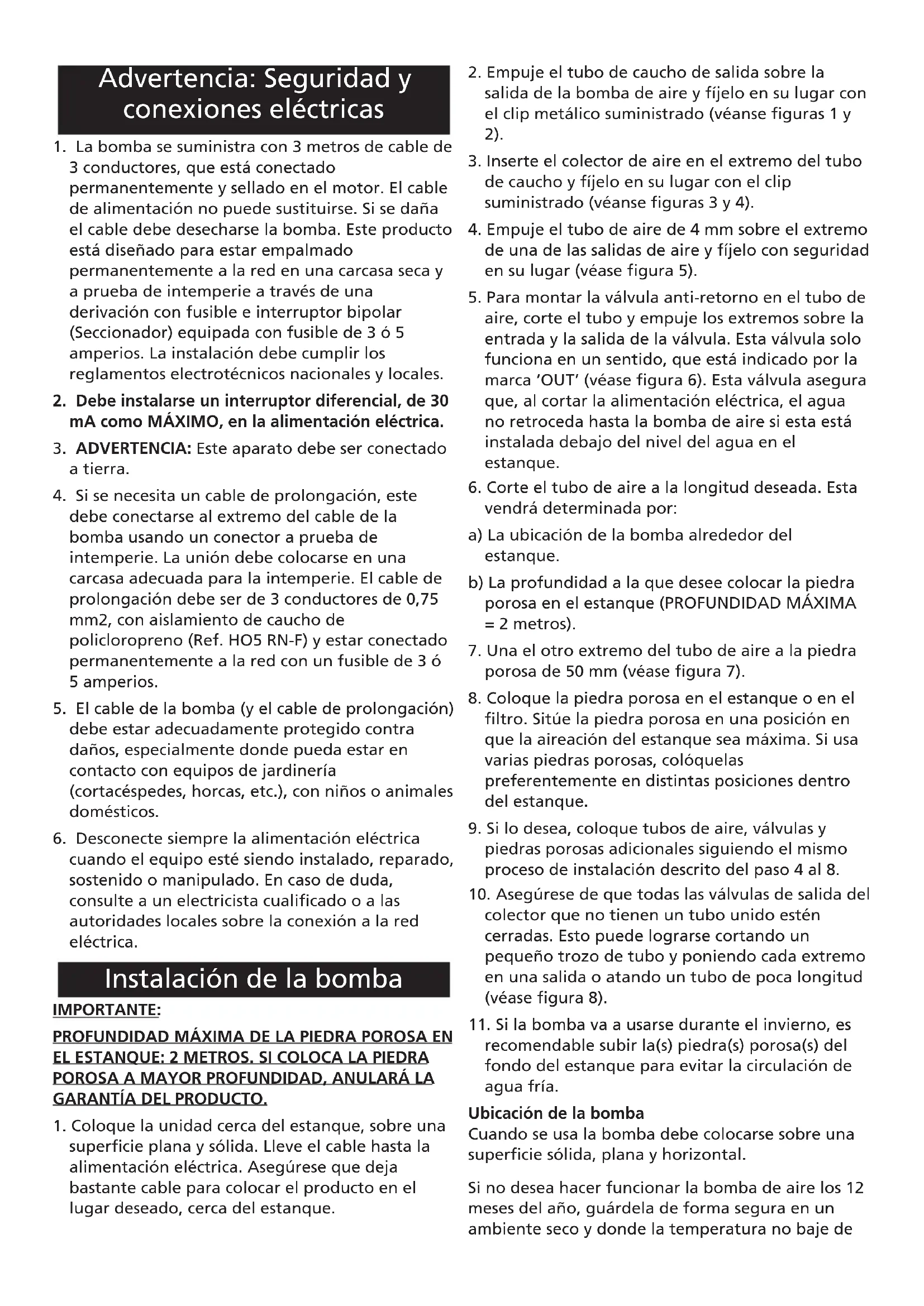cuando el equipo esté siendo instalado, reparado, sostenido o manipulado. En caso de duda, consulte a un electricista cualificado o a las autoridades locales sobre la conexión a la red eléctrica. IMPORTANTE: PROFUNDIDAD MÁXIMA DE LA PIEDRA POROSA EN EL ESTANQUE: 2 METROS. SI COLOCA LA PIEDRA