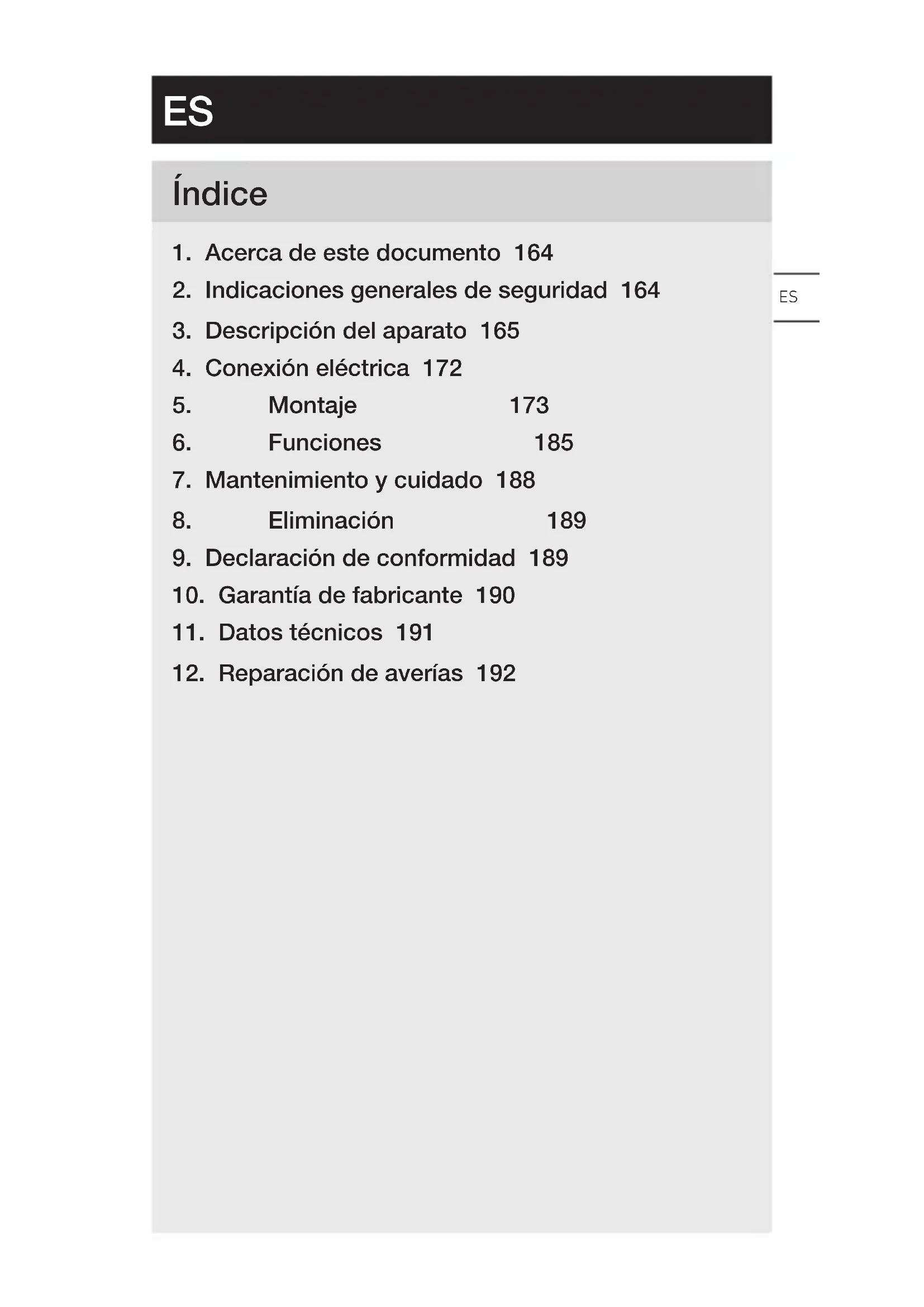 - Limpiar el aparato con un paño ligeramente humedeci- do sin detergente. Importante: El controlador no puede sustituirse.ES – 189 – Índice