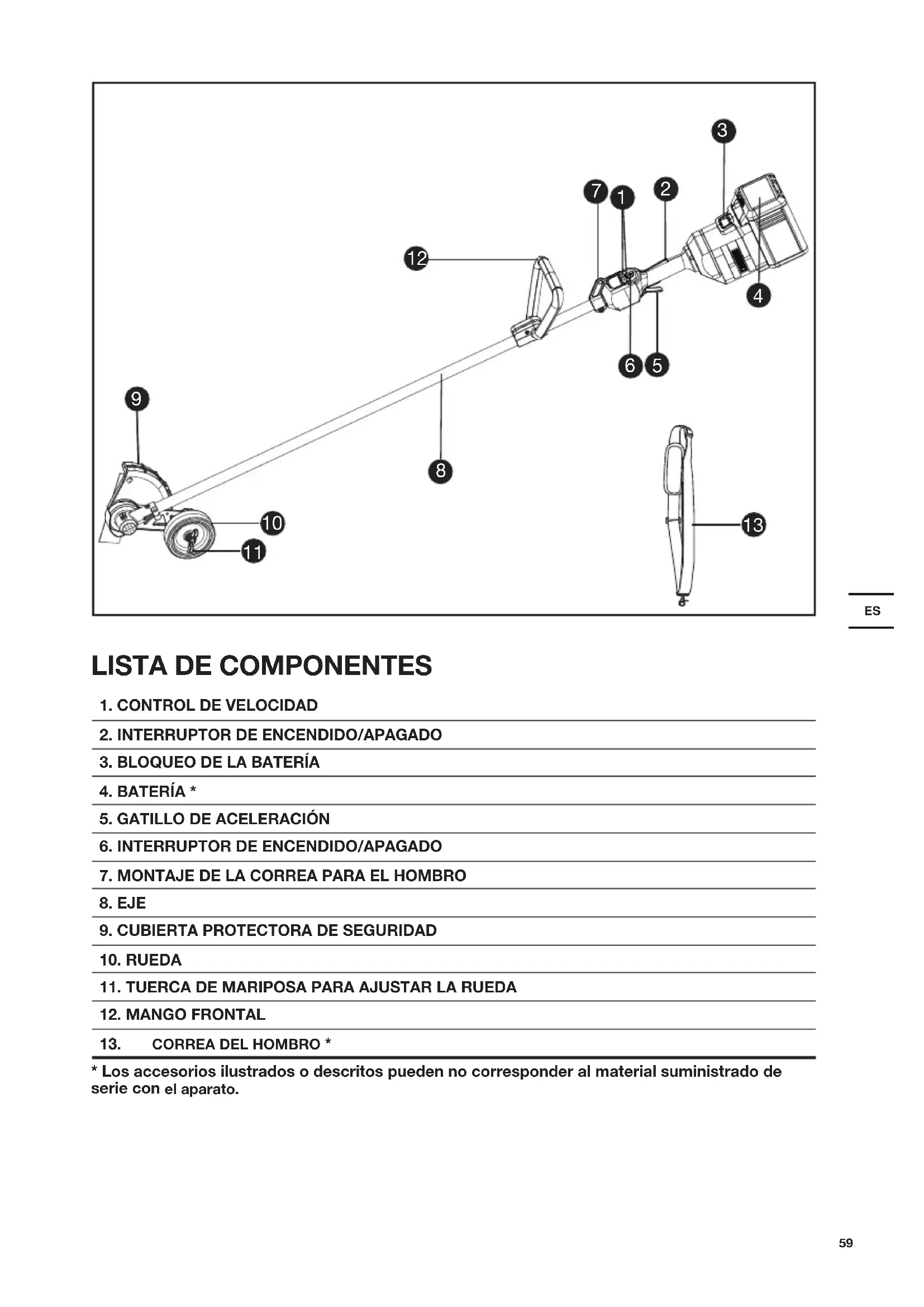 a) El funcionamiento de este dispositivo está sujeto a las siguientes condiciones: (1) Este dispositivo no puede causar interferencias perjudiciales, y (2) debe aceptar cualquier interferencia recibida, incluyendo las que puedan causar un funcionamiento indeseado. b) Precaución: Los cambios o modicaciones a este aparato que no estén expresamente aprobados por la parte responsable del cumplimiento podrían anular la autoridad del usuario para utilizar el equipo. c) NOTA: Este equipo genera, usa y puede radiar energía de radiofrecuencia y, si no se instala y usa de acuerdo con las instrucciones, puede causar interferencias perjudiciales para las comunicaciones de radio. Sin embargo, no se garantiza que no ocurran interferencias en una instalación particular. Si este equipo causa interferencias perjudiciales en la recepción de radio o televisión, lo cual puede determinarse apagando y encendiendo el equipo, se recomienda al usuario que intente corregir las interferencias mediante una o varias de las siguientes medidas: - Reoriente o reubique la antena receptora. - Aumente la distancia entre el equipo y el receptor. - Conecte el equipo a una toma de corriente de un circuito diferente al que está conectado el receptor. - Consulte con el proveedor o un técnico con experiencia en radio/TV para obtener ayuda. SÍMBOLOS Para reducir el riesgo de lesión, lea el manual de instrucciones Utilice protección auditiva y ocular Dirección de rotación de la cuchilla de la bordeadoras Mantenga a los transeúntes a una distancia segura Objetos despedidos Cuchilla de corte rotatoria Los residuos de aparatos eléctricos y electrónicos no deben depositarse en la basura doméstica. Se deben reciclar en las instalaciones especializadas. Consulte a las autoridades locales o el establecimiento para saber cómo reciclar estos productos. Batería de ión de litio. Este producto se ha marcado con un símbolo relacionado con la "colección separada" para todos los paquetes de baterías y paquetes de baterías. Luego se reciclará o desmontará para reducir el impacto en el medio ambiente. Los paquetes de baterías pueden ser peligrosos para el medio ambiente y para la salud humana, ya que contienen sustancias peligrosas. No quemar64