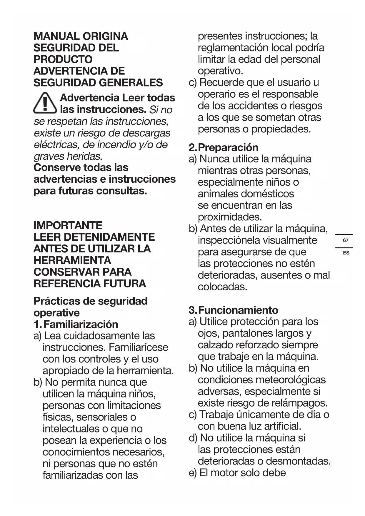 a) Utilice protección para los ojos, pantalones largos y calzado reforzado siempre que trabaje en la máquina. b) No utilice la máquina en condiciones meteorológicas adversas, especialmente si existe riesgo de relámpagos. c) Trabaje únicamente de día o con buena luz articial. d) No utilice la máquina si las protecciones están deterioradas o desmontadas. e) El motor solo debe68