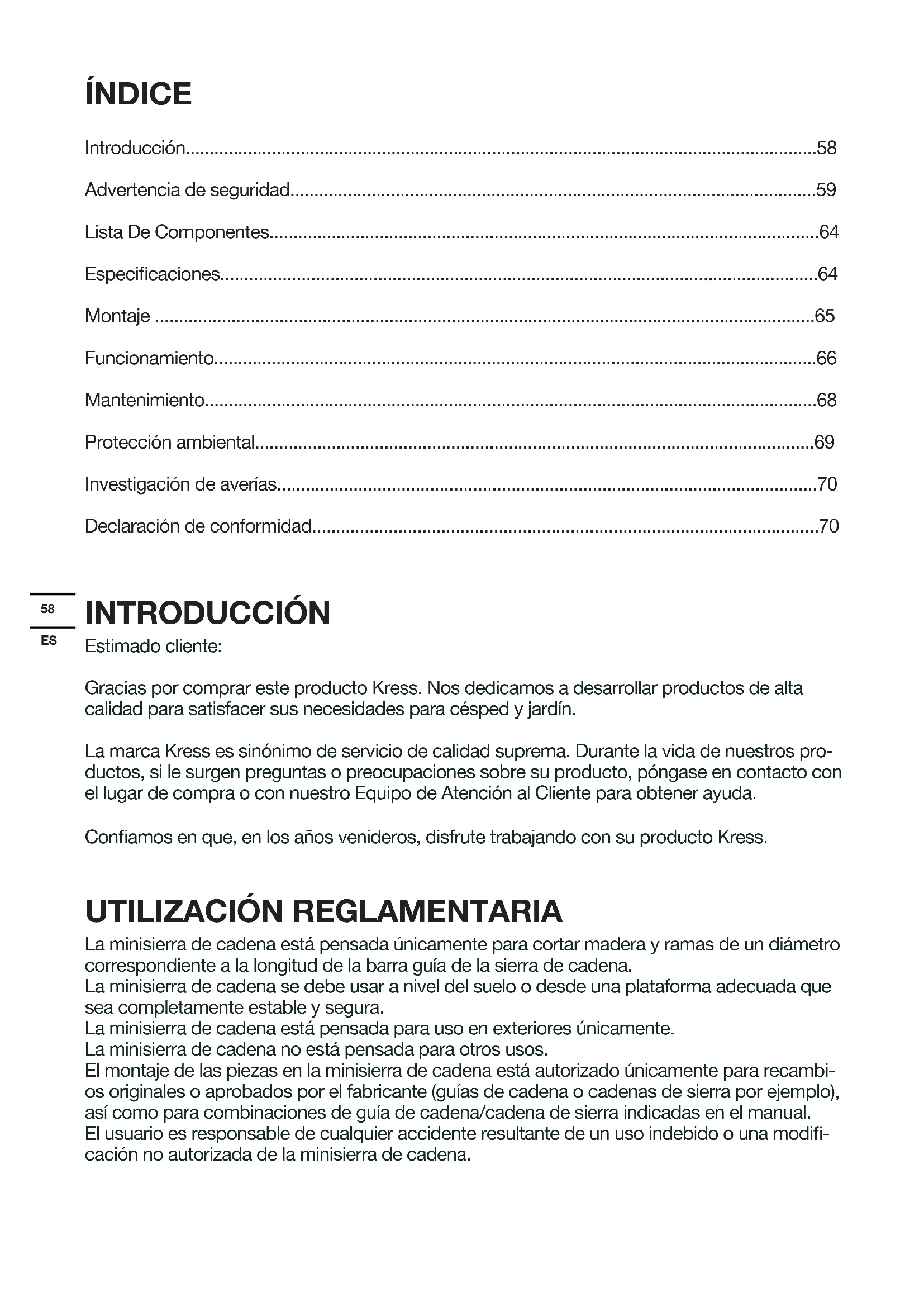 La minisierra de cadena está pensada únicamente para cortar madera y ramas de un diámetro correspondiente a la longitud de la barra guía de la sierra de cadena. La minisierra de cadena se debe usar a nivel del suelo o desde una plataforma adecuada que sea completamente estable y segura. La minisierra de cadena está pensada para uso en exteriores únicamente. La minisierra de cadena no está pensada para otros usos. El montaje de las piezas en la minisierra de cadena está autorizado únicamente para recambi- os originales o aprobados por el fabricante (guías de cadena o cadenas de sierra por ejemplo), así como para combinaciones de guía de cadena/cadena de sierra indicadas en el manual. El usuario es responsable de cualquier accidente resultante de un uso indebido o una modi- cación no autorizada de la minisierra de cadena.59