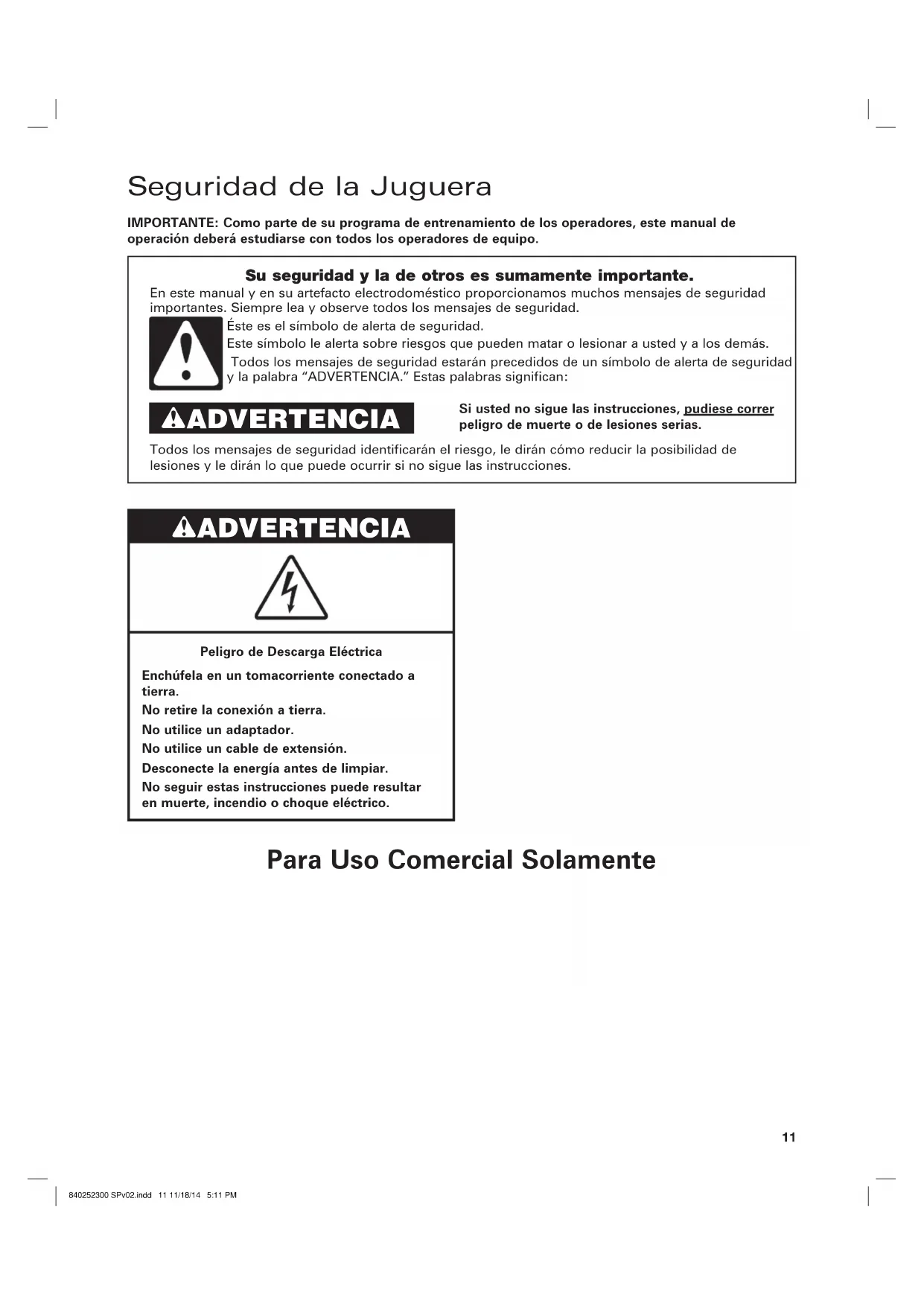 - Une pression trop forte entraînera des écorces, dont le goût est amer, dans le jus. 840252300 FRv02.indd 9 11/18/14 5:00 PM10 Notes 840252300 FRv02.indd 10 11/18/14 5:00 PM11 Su seguridad y la de otros es sumamente importante. En este manual y en su artefacto electrodoméstico proporcionamos muchos mensajes de seguridad importantes. Siempre lea y observe todos los mensajes de seguridad. Éste es el símbolo de alerta de seguridad. Este símbolo le alerta sobre riesgos que pueden matar o lesionar a usted y a los demás. Todos los mensajes de seguridad estarán precedidos de un símbolo de alerta de seguridad y la palabra “ADVERTENCIA.” Estas palabras significan: wADVERTENCIA Si usted no sigue las instrucciones, pudiese correr peligro de muerte o de lesiones serias. Todos los mensajes de seguridad identificarán el riesgo, le dirán cómo reducir la posibilidad de lesiones y le dirán lo que puede ocurrir si no sigue las instrucciones. Seguridad de la Juguera IMPORTANTE: Como parte de su programa de entrenamiento de los operadores, este manual de operación deberá estudiarse con todos los operadores de equipo. wADVERTENCIA Peligro de Descarga Eléctrica Enchúfela en un tomacorriente conectado a tierra. No retire la conexión a tierra. No utilice un adaptador. No utilice un cable de extensión. Desconecte la energía antes de limpiar. No seguir estas instrucciones puede resultar en muerte, incendio o choque eléctrico. Para Uso Comercial Solamente 840252300 SPv02.indd 11 11/18/14 5:11 PM12
