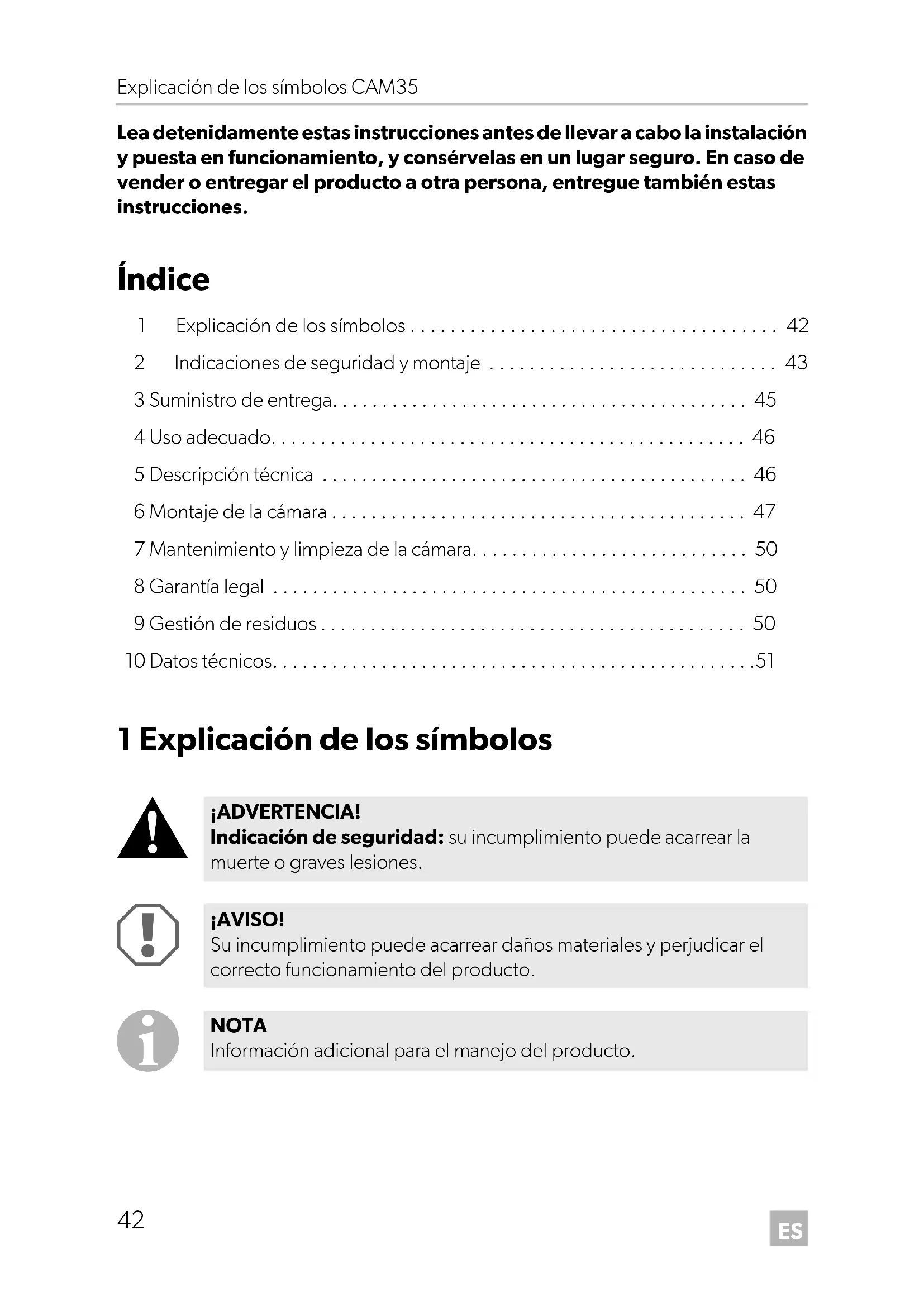 ¡ADVERTENCIA! Indicación de seguridad: su incumplimiento puede acarrear la muerte o graves lesiones. ¡AVISO! Su incumplimiento puede acarrear daños materiales y perjudicar el correcto funcionamiento del producto. NOTA Información adicional para el manejo del producto. CAM35-IO-16s.book Seite 42 Dienstag, 21. Februar 2017 5:31 17ES CAM35 Indicaciones de seguridad y montaje