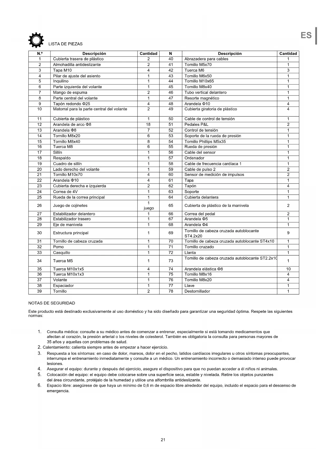 11. Partes salientes: preste atención a los ajustadores salientes y otras partes estructurales que puedan interferir en su entrenamiento. 12. Uso previsto: utilice el equipo para el fin previsto. En caso de daños o ruidos molestos, interrumpa el entrenamiento y no utilice el dispositivo hasta que se haya solucionado el problema. 13. Ropa deportiva: haga ejercicio con ropa cómoda y calzado deportivo. Evite la ropa holgada que pueda engancharse en el equipo. 14. Clase del equipo: el dispositivo pertenece a la clase H según la norma EN ISO 20957-1 y está destinado exclusivamente al uso doméstico. No es adecuado para uso terapéutico, de rehabilitación o comercial.