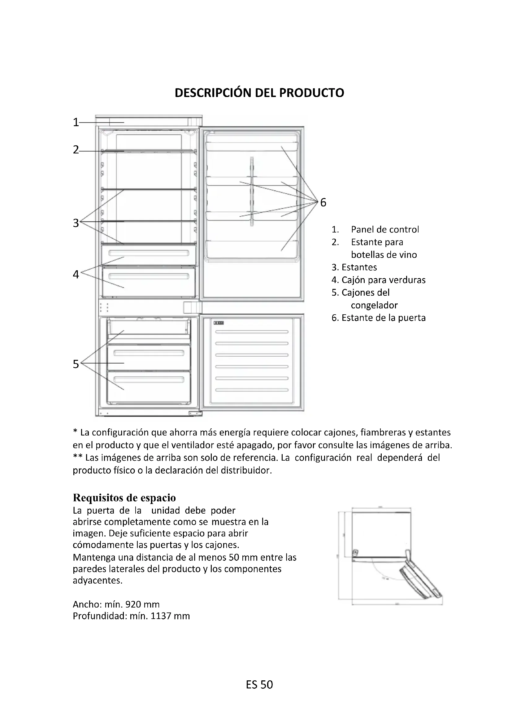 - La configuración que ahorra más energía requiere colocar cajones, fiambreras y estantes en el producto y que el ventilador esté apagado, por favor consulte las imágenes de arriba. ** Las imágenes de arriba son solo de referencia. La configuración real dependerá del producto físico o la declaración del distribuidor. Requisitos de espacio La puerta de la unidad debe poder abrirse completamente como se muestra en la imagen. Deje suficiente espacio para abrir cómodamente las puertas y los cajones. Mantenga una distancia de al menos 50 mm entre las paredes laterales del producto y los componentes adyacentes. Ancho: mín. 920 mm Profundidad: mín. 1137 mm