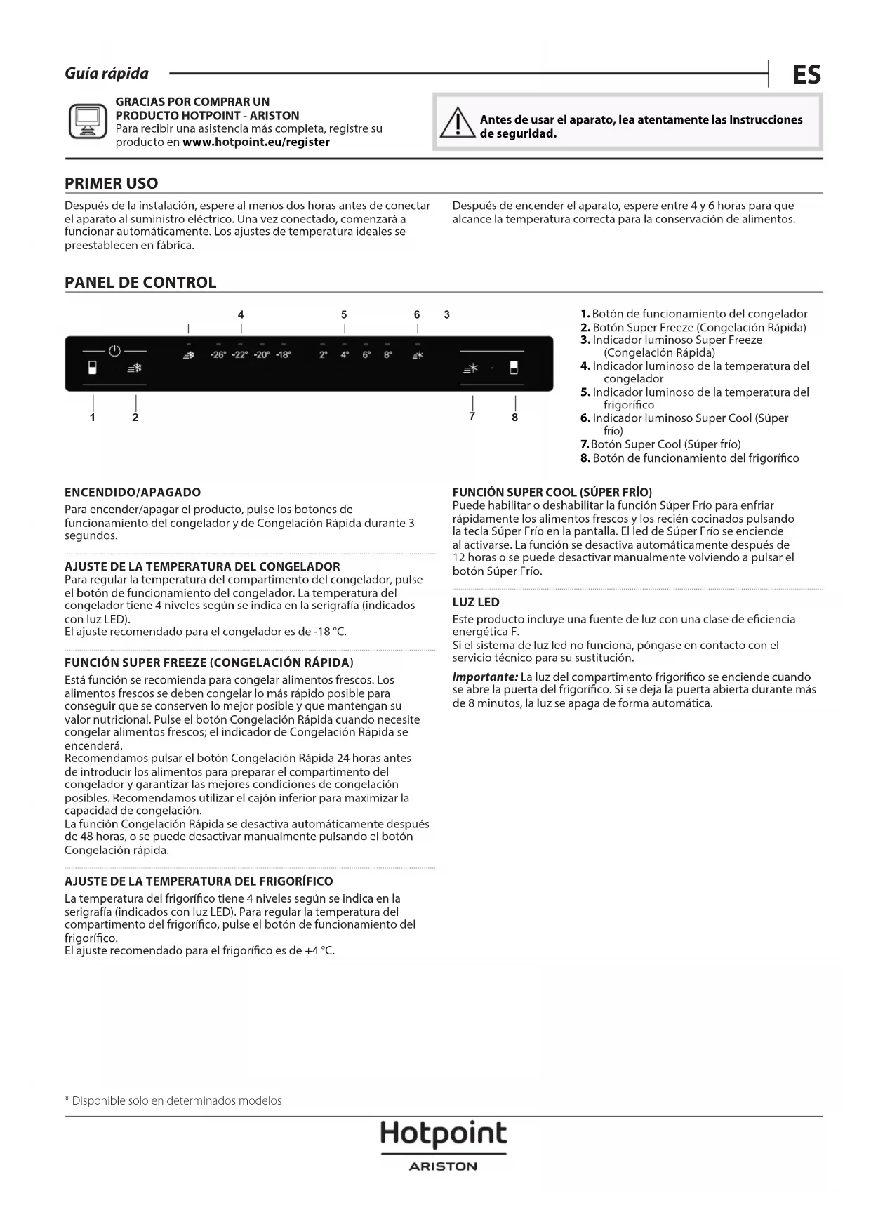 Para recibir una asistencia más completa, registre su producto en www . hotpoint . eu/ register Antes de usar el aparato, lea atentamente las Instrucciones de seguridad. PRIMER USO Después de la instalación, espere al menos dos horas antes de conectar el aparato al suministro eléctrico. Una vez conectado, comenzará a funcionar automáticamente. Los ajustes de temperatura ideales se preestablecen en fábrica. Después de encender el aparato, espere entre 4 y 6horas para que alcance la temperatura correcta para la conservación de alimentos.