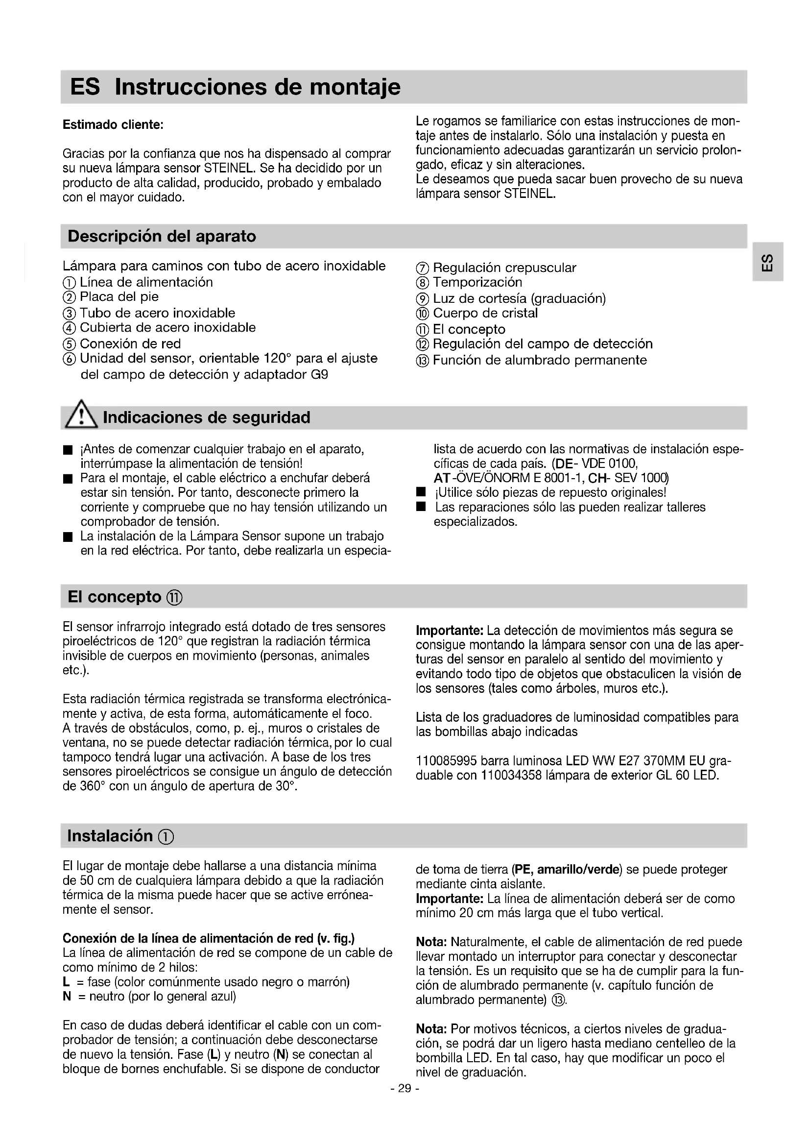 Solo per paesi UE: Conformemente alla Direttiva Europea vigente in materia di rifiuti di apparecchi elettrici ed elettronici e alla sua attua- zione nel diritto nazionale, gli apparecchi elettrici ed elettro- nici non più idonei all’uso devono essere separati dagli altri rifiuti e consegnati a un centro di riciclaggio riconosciuto. Sorgente luminosa sostituibile con utenza terminale.- 29 - Instalación El lugar de montaje debe hallarse a una distancia mínima de 50 cm de cualquiera lámpara debido a que la radiación térmica de la misma puede hacer que se active errónea- mente el sensor. Conexión de la línea de alimentación de red (v. fig.) La línea de alimentación de red se compone de un cable de como mínimo de 2 hilos: L = fase (color comúnmente usado negro o marrón) N = neutro (por lo general azul) En caso de dudas deberá identificar el cable con un com- probador de tensión; a continuación debe desconectarse de nuevo la tensión. Fase (L) y neutro (N) se conectan al bloque de bornes enchufable. Si se dispone de conductor El concepto El sensor infrarrojo integrado está dotado de tres sensores piroeléctricos de 120° que registran la radiación térmica invisible de cuerpos en movimiento (personas, animales etc.). Esta radiación térmica registrada se transforma electrónica- mente y activa, de esta forma, automáticamente el foco. A través de obstáculos, como, p. ej., muros o cristales de ventana, no se puede detectar radiación térmica, por lo cual tampoco tendrá lugar una activación. A base de los tres sensores piroeléctricos se consigue un ángulo de detección de 360° con un ángulo de apertura de 30°. Descripción del aparato Lámpara para caminos con tubo de acero inoxidable Línea de alimentación Placa del pie Tubo de acero inoxidable Cubierta de acero inoxidable Conexión de red Unidad del sensor, orientable 120° para el ajuste del campo de detección y adaptador G9 ES Instrucciones de montaje Estimado cliente: Gracias por la confianza que nos ha dispensado al comprar su nueva lámpara sensor STEINEL. Se ha decidido por un producto de alta calidad, producido, probado y embalado con el mayor cuidado. Indicaciones de seguridad