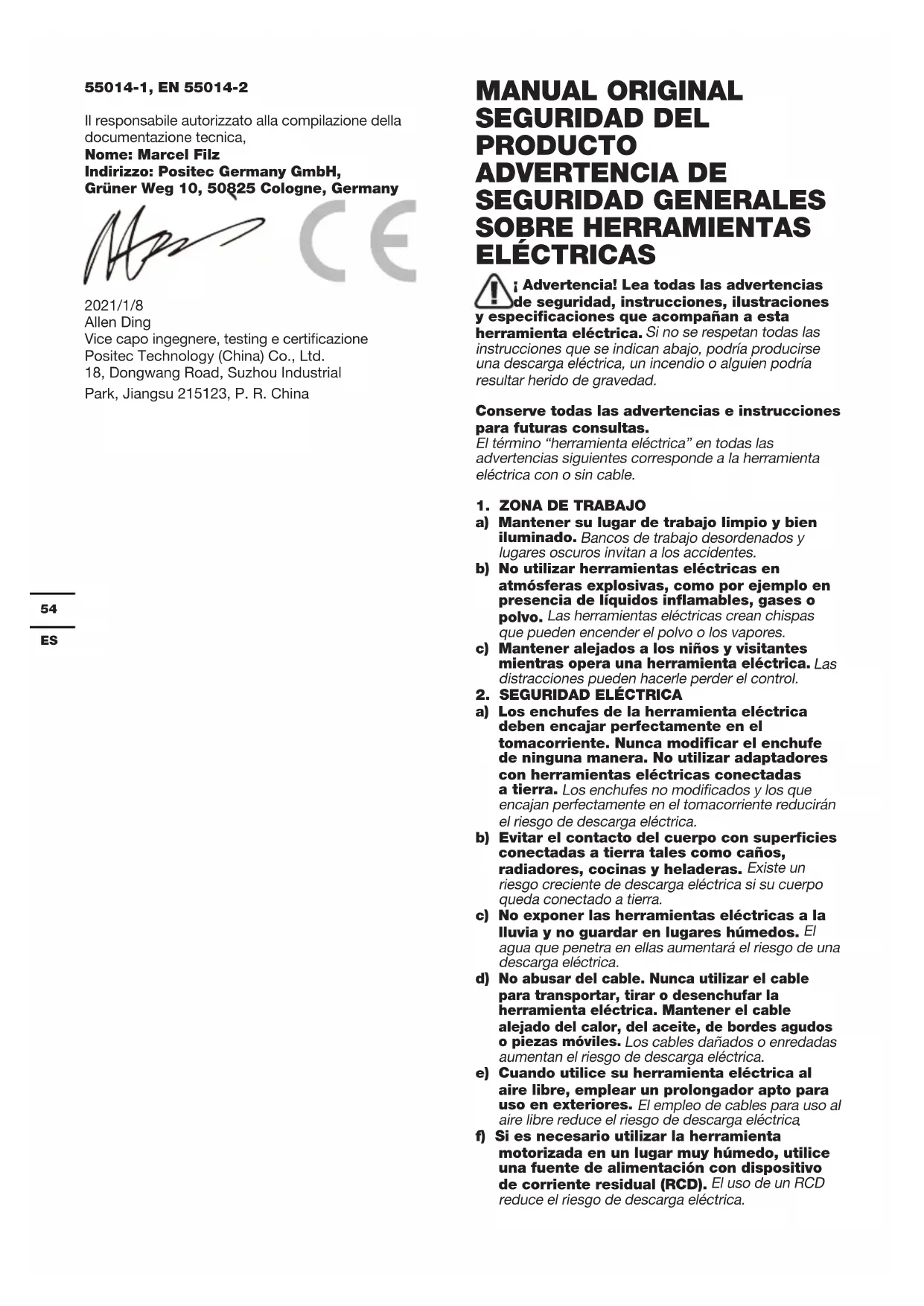 55014-1, EN 55014-2 Il responsabile autorizzato alla compilazione della documentazione tecnica, Nome: Marcel Filz Indirizzo: Positec Germany GmbH, Grüner Weg 10, 50825 Cologne, Germany 2021/1/8 Allen Ding Vice capo ingegnere, testing e certicazione Positec Technology (China) Co., Ltd. 18, Dongwang Road, Suzhou Industrial Park, Jiangsu 215123, P. R. China MANUAL ORIGINAL SEGURIDAD DEL PRODUCTO ADVERTENCIA DE SEGURIDAD GENERALES SOBRE HERRAMIENTAS ELÉCTRICAS ¡ Advertencia! Lea todas las advertencias de seguridad, instrucciones, ilustraciones y especificaciones que acompañan a esta herramienta eléctrica. Si no se respetan todas las instrucciones que se indican abajo, podría producirse una descarga eléctrica, un incendio o alguien podría resultar herido de gravedad. Conserve todas las advertencias e instrucciones para futuras consultas. El término “herramienta eléctrica” en todas las advertencias siguientes corresponde a la herramienta eléctrica con o sin cable.