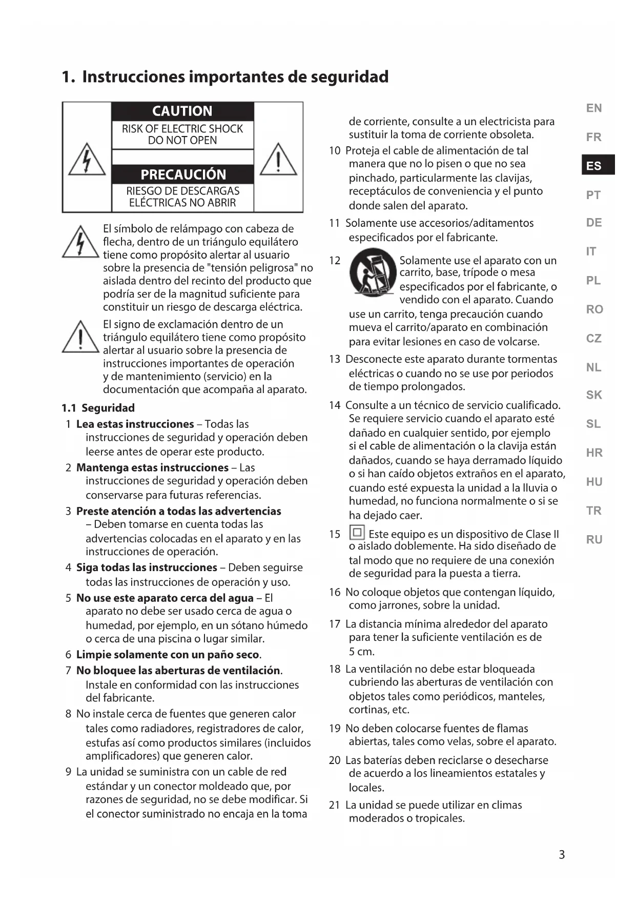 1 Lea estas instrucciones – Todas las instrucciones de seguridad y operación deben leerse antes de operar este producto. 2 Mantenga estas instrucciones – Las instrucciones de seguridad y operación deben conservarse para futuras referencias. 3 Preste atención a todas las advertencias – Deben tomarse en cuenta todas las advertencias colocadas en el aparato y en las instrucciones de operación. 4 Siga todas las instrucciones – Deben seguirse todas las instrucciones de operación y uso. 5 No use este aparato cerca del agua – El aparato no debe ser usado cerca de agua o humedad, por ejemplo, en un sótano húmedo o cerca de una piscina o lugar similar. 6 Limpie solamente con un paño seco. 7 No bloquee las aberturas de ventilación. Instale en conformidad con las instrucciones del fabricante. 8 No instale cerca de fuentes que generen calor tales como radiadores, registradores de calor, estufas así como productos similares (incluidos amplificadores) que generen calor. 9 La unidad se suministra con un cable de red estándar y un conector moldeado que, por razones de seguridad, no se debe modificar. Si el conector suministrado no encaja en la toma