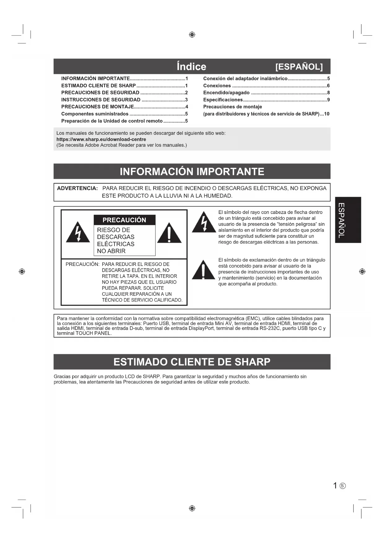 Para mantener la conformidad con la normativa sobre compatibilidad electromagnética (EMC), utilice cables blindados para la conexión a los siguientes terminales: Puerto USB, terminal de entrada Mini AV, terminal de entrada HDMI, terminal de salida HDMI, terminal de entrada D-sub, terminal de entrada DisplayPort, terminal de entrada RS-232C, puerto USB tipo C y terminal TOUCH PANEL.Los manuales de funcionamiento se pueden descargar del siguiente sitio web:https://www.sharp.eu/download-centre(Se necesita Adobe Acrobat Reader para ver los manuales.)2
