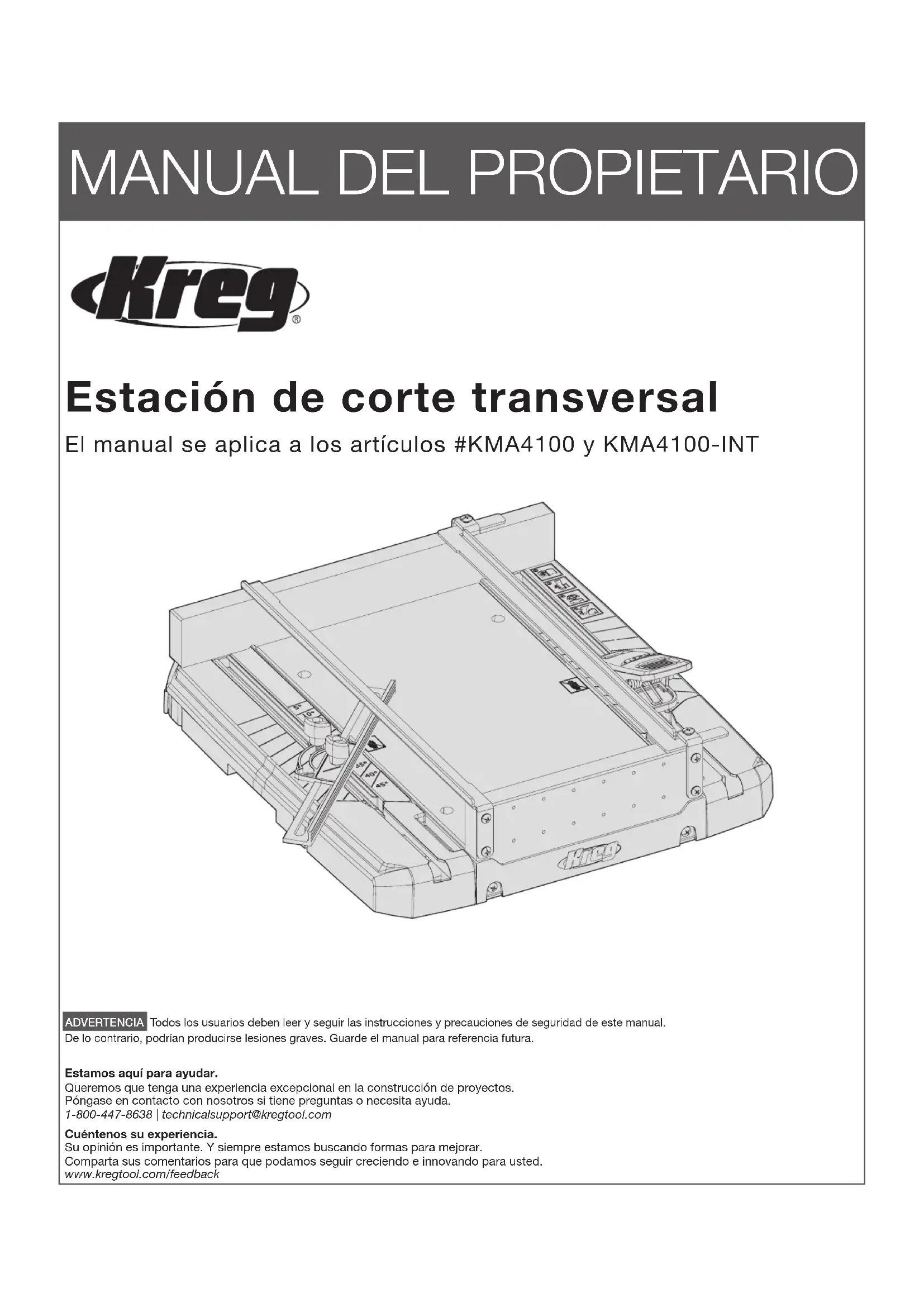 - Estamos aquí para ayudar. Queremos que tenga una experiencia excepcional en la construcción de proyectos. Póngase en contacto con nosotros si tiene preguntas o necesita ayuda. 1-800-447-8638 | technicalsupport@kregtool.com Cuéntenos su experiencia. Su opinión es importante. Y siempre estamos buscando formas para mejorar. Comparta sus comentarios para que podamos seguir creciendo e innovando para usted. www.kregtool.com/feedback ADVERTENCIA Todos los usuarios deben leer y seguir las instrucciones y precauciones de seguridad de este manual. De lo contrario, podrían producirse lesiones graves. Guarde el manual para referencia futura. Estación de corte transversal El manual se aplica a los artículos #KMA4100 y KMA4100-INT22 Precauciones de seguridad ADVERTENCIA Antes de usar una herramienta eléctrica con este producto, lea y siga las instrucciones yprecauciones de seguridad del fabricante de la herramienta además de las precauciones de seguridad que semuestran a continuación para reducir el riesgo de lesiones graves por peligros tales como incendios, descargas eléctricas o la hoja giratoria de la sierra. ■ Siga las instrucciones y las precauciones de seguridad del fabricante de la sierra. ■ Use siempre el equipo de protección personal que exige el fabricante de la sierra. ■ No permita que la familiaridad obtenida del uso frecuente de sus herramientas reemplace las prácticas de seguridad laboral. Un momento de descuido es suciente para causar lesiones graves. ■ Evite las posiciones incómodas de las manos donde un deslizamiento repentino podría causar contacto con la cuchilla giratoria. ■ Este producto está diseñado para usarse solo con sierras circulares. No está diseñado para su uso con otras herramientas eléctricas como fresadoras o sierras de vaivén. ■ Siempre je la estación de corte para evitar el movimiento mientras corta. ■ No intente hacer cortes biselados con este producto. ■ Inspeccione la pieza de trabajo antes de cortarla. Si la pieza de trabajo está curvada o torcida, asegúrese de que no haya distancia entre la pieza de trabajo y el cerco sobre la línea de corte. ■ Sujete siempre con rmeza la pieza de trabajo asegurándose de que la mano permanezca fuera del área de corte conforme a lo que indica el símbolo. ADVERTENCIA No opere esta herramienta ni ninguna maquinaria bajo la inuencia de drogas, alcohol omedicamentos. ADVERTENCIA Este producto podría exponerlo a productos químicos, incluido el acrilonitrilo, que el estado de California conoce como causantes de cáncer. Para obtener más información, visite www.P65Warnings.ca.gov. ADVERTENCIA Taladrar, serrar, lijar y trabajar a máquina con productos de madera puede exponerlo al aserrín, una sustancia que el estado de California conoce como causante de cáncer. Evite inhalar aserrín o useuna máscara antipolvo u otras medidas de protección personal. Para obtener más información, visite www.P65Warnings.ca.gov/wood. Preensamblaje ADVERTENCIA Evite cortar piezas de trabajo de forma irregular que puedan torcerse, moverse o deslizarse mientras las está cortando. Revise esta sección antes de comenzar. Asegúrese de tener a mano todas las herramientas/materiales incluidos en el paquete y compárelos con los artículos enumerados en las secciones Herraje incluido y Descripción del producto. Si falta algún artículo, no use este producto. Póngase en contacto con el servicio de atención al cliente o devuelva el producto al lugar de compra. Índice Precauciones de seguridad p. 22