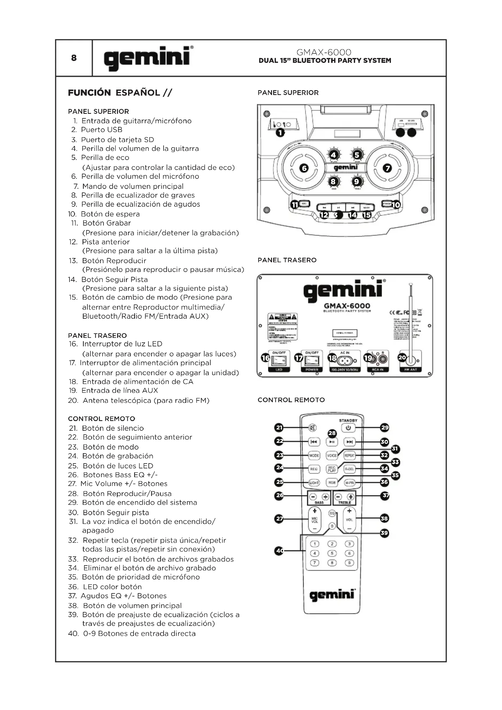 PANEL SUPERIOR1. Entrada de guitarra/micrófono2. Puerto USB3. Puerto de tarjeta SD4. Perilla del volumen de la guitarra5. Perilla de eco (Ajustar para controlar la cantidad de eco)6. Perilla de volumen del micrófono7. Mando de volumen principal8. Perilla de ecualizador de graves9. Perilla de ecualización de agudos10. Botón de espera11. Botón Grabar (Presione para iniciar/detener la grabación)12. Pista anterior (Presione para saltar a la última pista)13. Botón Reproducir (Presiónelo para reproducir o pausar música)14. Botón Seguir Pista (Presione para saltar a la siguiente pista)15. Botón de cambio de modo (Presione para alternar entre Reproductor multimedia/Bluetooth/Radio FM/Entrada AUX)PANEL TRASERO16. Interruptor de luz LED (alternar para encender o apagar las luces)17. Interruptor de alimentación principal (alternar para encender o apagar la unidad)18. Entrada de alimentación de CA19. Entrada de línea AUX20. Antena telescópica (para radio FM)CONTROL REMOTO21. Botón de silencio22. Botón de seguimiento anterior23. Botón de modo24. Botón de grabación25. Botón de luces LED26. Botones Bass EQ +/-27. Mic Volume +/- Botones28. Botón Reproducir/Pausa29. Botón de encendido del sistema30. Botón Seguir pista31. La voz indica el botón de encendido/apagado32. Repetir tecla (repetir pista única/repetir todas las pistas/repetir sin conexión)33. Reproducir el botón de archivos grabados34. Eliminar el botón de archivo grabado35. Botón de prioridad de micrófono36. LED color botón37. Agudos EQ +/- Botones38. Botón de volumen principal39. Botón de preajuste de ecualización (ciclos a través de preajustes de ecualización)40. 0-9 Botones de entrada directaPANEL SUPERIORPANEL TRASEROCONTROL REMOTO1 2 34 56 78 9