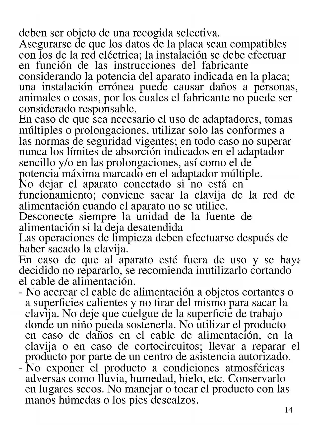 A continuación se presentan importantes indicaciones sobre la instalación, el uso y el mantenimiento. Conservar con cuidado este manual para cualquier consulta posterior; utilizar el producto solo de la manera que indica este manual de instrucciones; cualquier otro uso se considera inadecuado y peligroso; por ello el fabricante no puede ser considerado responsable en caso de que se produzcan daños derivados de usos inadecuados, erróneos o irracionales. Antes del uso asegurarse de la integridad del aparato; en caso de duda no utilizarlo y dirigirse al personal de asistencia; no dejar los elementos del embalaje (bolsas de plástico, poliestireno expandido, clavos, grapas, etc.) al alcance de los niños ya que son fuentes potenciales de peligro; además, cabe recordar que los citados elementos14 deben ser objeto de una recogida selectiva. Asegurarse de que los datos de la placa sean compatibles con los de la red eléctrica; la instalación se debe efectuar en función de las instrucciones del fabricante considerando la potencia del aparato indicada en la placa; una instalación errónea puede causar daños a personas, animales o cosas, por los cuales el fabricante no puede ser considerado responsable. En caso de que sea necesario el uso de adaptadores, tomas múltiples o prolongaciones, utilizar solo las conformes a las normas de seguridad vigentes; en todo caso no superar nunca los límites de absorción indicados en el adaptador sencillo y/o en las prolongaciones, así como el de potencia máxima marcado en el adaptador múltiple. No dejar el aparato conectado si no está en funcionamiento; conviene sacar la clavija de la red de alimentación cuando el aparato no se utilice. Desconecte siempre la unidad de la fuente de alimentación si la deja desatendida Las operaciones de limpieza deben efectuarse después de haber sacado la clavija. En caso de que al aparato esté fuera de uso y se haya decidido no repararlo, se recomienda inutilizarlo cortando el cable de alimentación. - No acercar el cable de alimentación a objetos cortantes o a superficies calientes y no tirar del mismo para sacar la clavija. No deje que cuelgue de la superficie de trabajo donde un niño pueda sostenerla. No utilizar el producto en caso de daños en el cable de alimentación, en la clavija o en caso de cortocircuitos; llevar a reparar el producto por parte de un centro de asistencia autorizado. - No exponer el producto a condiciones atmosféricas adversas como lluvia, humedad, hielo, etc. Conservarlo en lugares secos. No manejar o tocar el producto con las manos húmedas o los pies descalzos.15 - Este aparato puede ser utilizado por niños a partir de 8 años y por personas con capacidades físicas, sensoriales o mentales reducidas o con falta de experiencia o conocimiento si a dichas personas se ha asegurado una supervisión adecuada o bien si han recibido instrucciones sobre el uso seguro del aparato; las operaciones de limpieza y de mantenimiento no deben ser efectuadas por niños a no ser que tengan más de 8 años y estén supervisados. - Los niños no deben jugar con el aparato. - Mantener el producto y el cable fuera del alcance de los niños menores de 8 años. Si el cable de alimentación está dañado, o en caso de una falla y/o mal funcionamiento, no manipule el aparato. Cualquier reparación debe ser realizada por el fabricante o por su servicio de asistencia técnica o, en cualquier caso, por una persona con una calificación similar, a fin de evitar cualquier riesgo. El incumplimiento de lo anterior puede comprometer la seguridad del dispositivo e invalidar los términos de la garantía. Este aparato está diseñado para uso doméstico o similares: cocinas para el personal de tiendas, oficinas u otros centros de trabajo, para clientes de hoteles, moteles, hostales y similares. El aparato no está diseñado para su uso a través de temporizadores externos o mandos a distancia. Antes de cada uso, desenrolle el cable de alimentación. Utilice únicamente piezas de repuesto y accesorios originales. No someta el producto a impactos fuertes se producirán daños serios. Mantenga la unidad lejos de materiales inflamables, calor, puntos fríos y vapor.