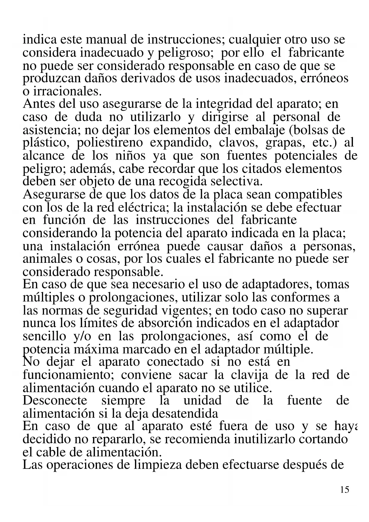A continuación se presentan importantes indicaciones sobre la instalación, el uso y el mantenimiento. Conservar con cuidado este manual para cualquier consulta posterior; utilizar el producto solo de la manera que15 indica este manual de instrucciones; cualquier otro uso se considera inadecuado y peligroso; por ello el fabricante no puede ser considerado responsable en caso de que se produzcan daños derivados de usos inadecuados, erróneos o irracionales. Antes del uso asegurarse de la integridad del aparato; en caso de duda no utilizarlo y dirigirse al personal de asistencia; no dejar los elementos del embalaje (bolsas de plástico, poliestireno expandido, clavos, grapas, etc.) al alcance de los niños ya que son fuentes potenciales de peligro; además, cabe recordar que los citados elementos deben ser objeto de una recogida selectiva. Asegurarse de que los datos de la placa sean compatibles con los de la red eléctrica; la instalación se debe efectuar en función de las instrucciones del fabricante considerando la potencia del aparato indicada en la placa; una instalación errónea puede causar daños a personas, animales o cosas, por los cuales el fabricante no puede ser considerado responsable. En caso de que sea necesario el uso de adaptadores, tomas múltiples o prolongaciones, utilizar solo las conformes a las normas de seguridad vigentes; en todo caso no superar nunca los límites de absorción indicados en el adaptador sencillo y/o en las prolongaciones, así como el de potencia máxima marcado en el adaptador múltiple. No dejar el aparato conectado si no está en funcionamiento; conviene sacar la clavija de la red de alimentación cuando el aparato no se utilice. Desconecte siempre la unidad de la fuente de alimentación si la deja desatendida En caso de que al aparato esté fuera de uso y se haya decidido no repararlo, se recomienda inutilizarlo cortando el cable de alimentación. Las operaciones de limpieza deben efectuarse después de16 haber sacado la clavija. - No acercar el cable de alimentación a objetos cortantes o a superficies calientes y no tirar del mismo para sacar la clavija. No deje que cuelgue de la superficie de trabajo donde un niño pueda sostenerla. No utilizar el producto en caso de daños en el cable de alimentación, en la clavija o en caso de cortocircuitos; llevar a reparar el producto por parte de un centro de asistencia autorizado. - No exponer el producto a condiciones atmosféricas adversas como lluvia, humedad, hielo, etc. Conservarlo en lugares secos. No manejar o tocar el producto con las manos húmedas o los pies descalzos. - Este aparato no debe ser usado por niños, incluso si son mayores de 8 años. - Este aparato puede ser utilizado por personas con capacidades físicas, sensoriales o mentales reducidas o con falta de experiencia o conocimiento si a dichas personas se ha asegurado una supervisión o bien si han recibido instrucciones sobre el uso seguro del aparato. - Los niños no deben jugar con el aparato. - Mantener el producto y el cable fuera del alcance de los niños menores de 8 años. - No apto para uso comercial. Solo para uso doméstico Si el cable de alimentación está dañado, o en caso de una falla y/o mal funcionamiento, no manipule el aparato. Cualquier reparación debe ser realizada por el fabricante o por su servicio de asistencia técnica o, en cualquier caso, por una persona con una calificación similar, a fin de evitar cualquier riesgo. El incumplimiento de lo anterior puede comprometer la seguridad del dispositivo e invalidar los términos de la garantía. Antes de cada uso, desenrolle el cable de alimentación. Este aparato está diseñado para uso doméstico o similares: cocinas para el personal de tiendas, oficinas u17 otros centros de trabajo, para clientes de hoteles, moteles, hostales y similares. El aparato no está diseñado para su uso a través de temporizadores externos o mandos a distancia. Utilice únicamente piezas de repuesto y accesorios originales. No someta el producto a impactos fuertes se producirán daños serios. Mantenga la unidad lejos de materiales inflamables, calor, puntos fríos y vapor.