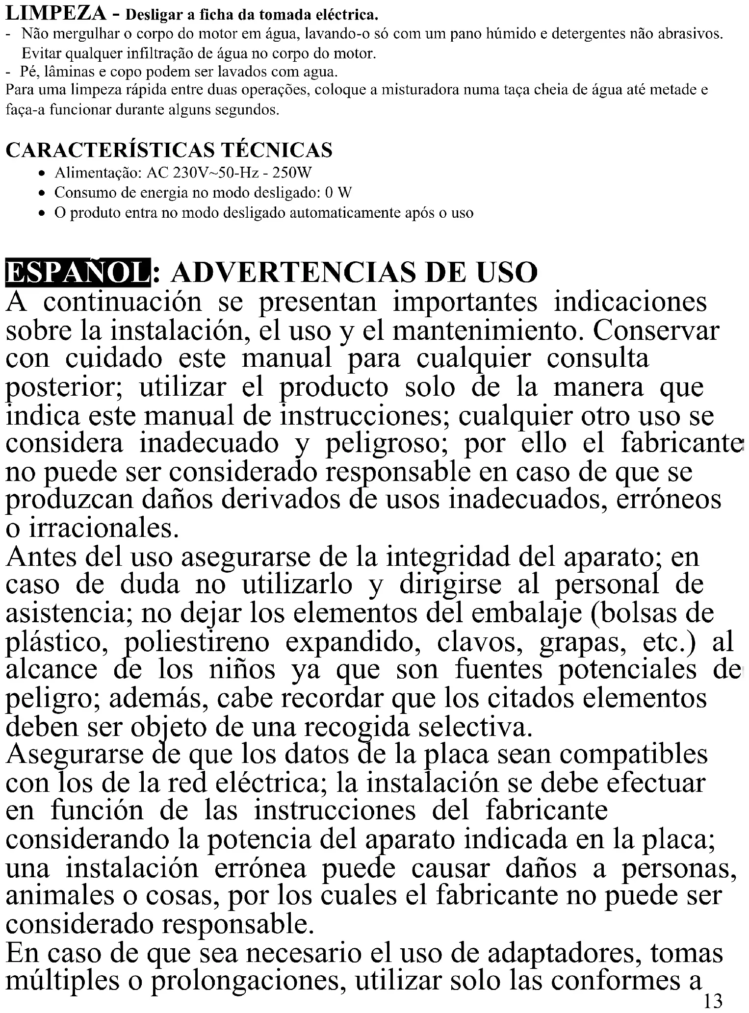 Las cuchillas son muy cortantes: extremar la atención para no cortarse durante el uso, la limpieza y la retirada de los preparados. Para el primer uso lavar con cuidado las partes que entrarán en contacto con los alimentos: tronco y cuchillas. Para evitar el sobrecalentamiento del motor no utilizar el aparato en función continua durante más de 1 minuto; en ese caso espaciar el uso con al menos 5 minutos de descanso. No utilizar en vacío el producto. No dejar nunca el aparato sin supervisión mientras esté en funcionamiento. Para la limpieza del tronco se aconseja utilizar solamente agua templada, limitando el uso de detergentes. En ese caso enjuagar abundantemente. No sumergir la parte16 superior de la licuadora en agua o en otros líquidos; para limpiarla utilizar un paño húmedo. Atención: Sacar la clavija de la toma de corriente antes de tocar las cuchillas para limpiarlas o para retirar alimentos que se hayan pegado en la fase de elaboración. Después del uso, colocar el producto lejos del alcance de los niños.