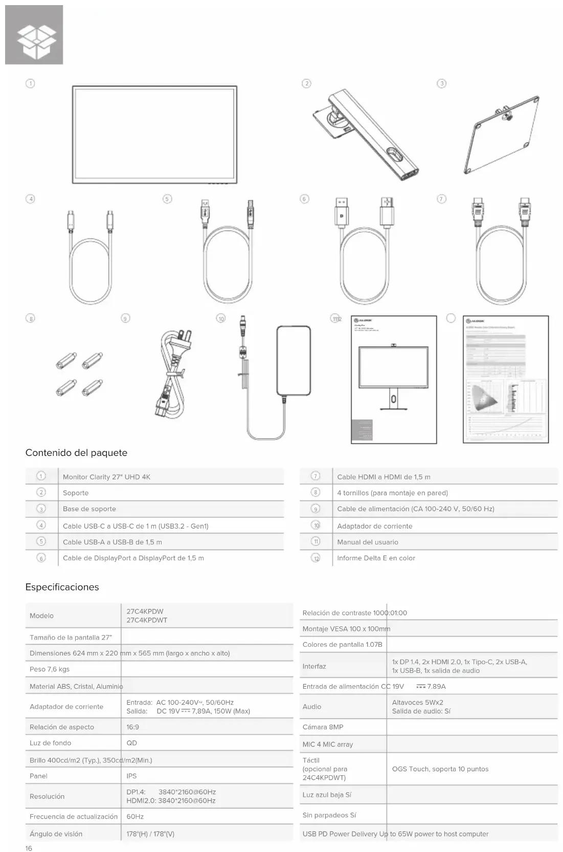 Modelo 27C4KPDW 27C4KPDWT Tamaño de la pantalla 27” Dimensiones 624 mm x 220 mm x 565 mm (largo x ancho x alto) Peso 7,6 kgs Material ABS, Cristal, Aluminio Adaptador de corriente Entrada: AC 100-240V~, 50/60Hz Salida: DC 19V 7,89A, 150W (Max) Relación de aspecto 16:9 Luz de fondo QD Brillo 400cd/m2 (Typ.), 350cd/m2(Min.) Panel IPS Resolución DP1.4: 3840*2160@60Hz HDMI2.0: 3840*2160@60Hz Frecuencia de actualización 60Hz Ángulo de visión 178°(H) / 178°(V) Especificaciones SchnellstartanleitungQuick Start Gu ideGuida RapidaGuide de démar rage rapideGuía de inicio rápidoクイックス タートガ イドКраткое руководство пользователя Clarity Pro 27” 4K UHD Monitor