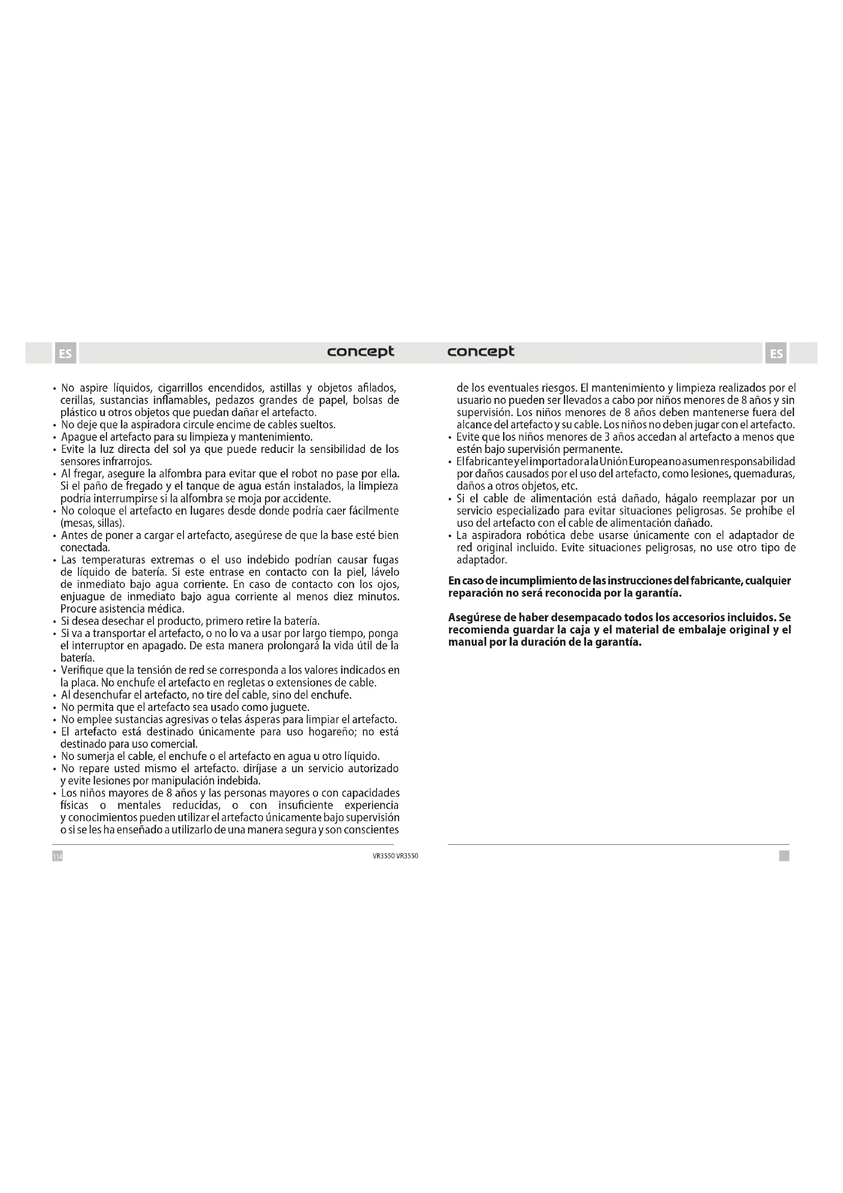 - La aspiradora robótica debe usarse únicamente con el adaptador de red original incluido. Evite situaciones peligrosas, no use otro tipo de adaptador. En caso de incumplimiento de las instrucciones del fabricante, cualquier reparación no será reconocida por la garantía. Asegúrese de haber desempacado todos los accesorios incluidos. Se recomienda guardar la caja y el material de embalaje original y el manual por la duración de la garantía.116 117 ESES VR3550 VR3550
