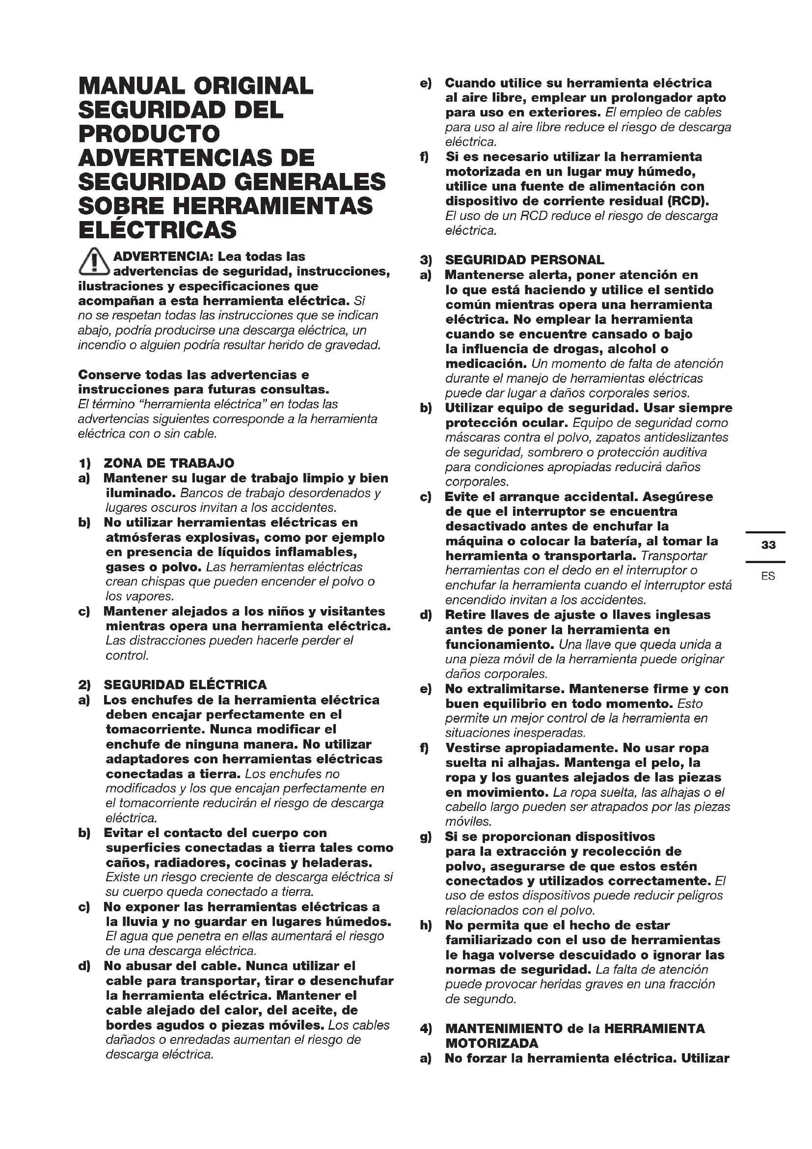 MANUAL ORIGINAL SEGURIDAD DEL PRODUCTO ADVERTENCIAS DE SEGURIDAD GENERALES SOBRE HERRAMIENTAS ELÉCTRICAS ADVERTENCIA: Lea todas las advertencias de seguridad, instrucciones, ilustraciones y especificaciones que acompañan a esta herramienta eléctrica. Si no se respetan todas las instrucciones que se indican abajo, podría producirse una descarga eléctrica, un incendio o alguien podría resultar herido de gravedad. Conserve todas las advertencias e instrucciones para futuras consultas. El término “herramienta eléctrica” en todas las advertencias siguientes corresponde a la herramienta eléctrica con o sin cable.