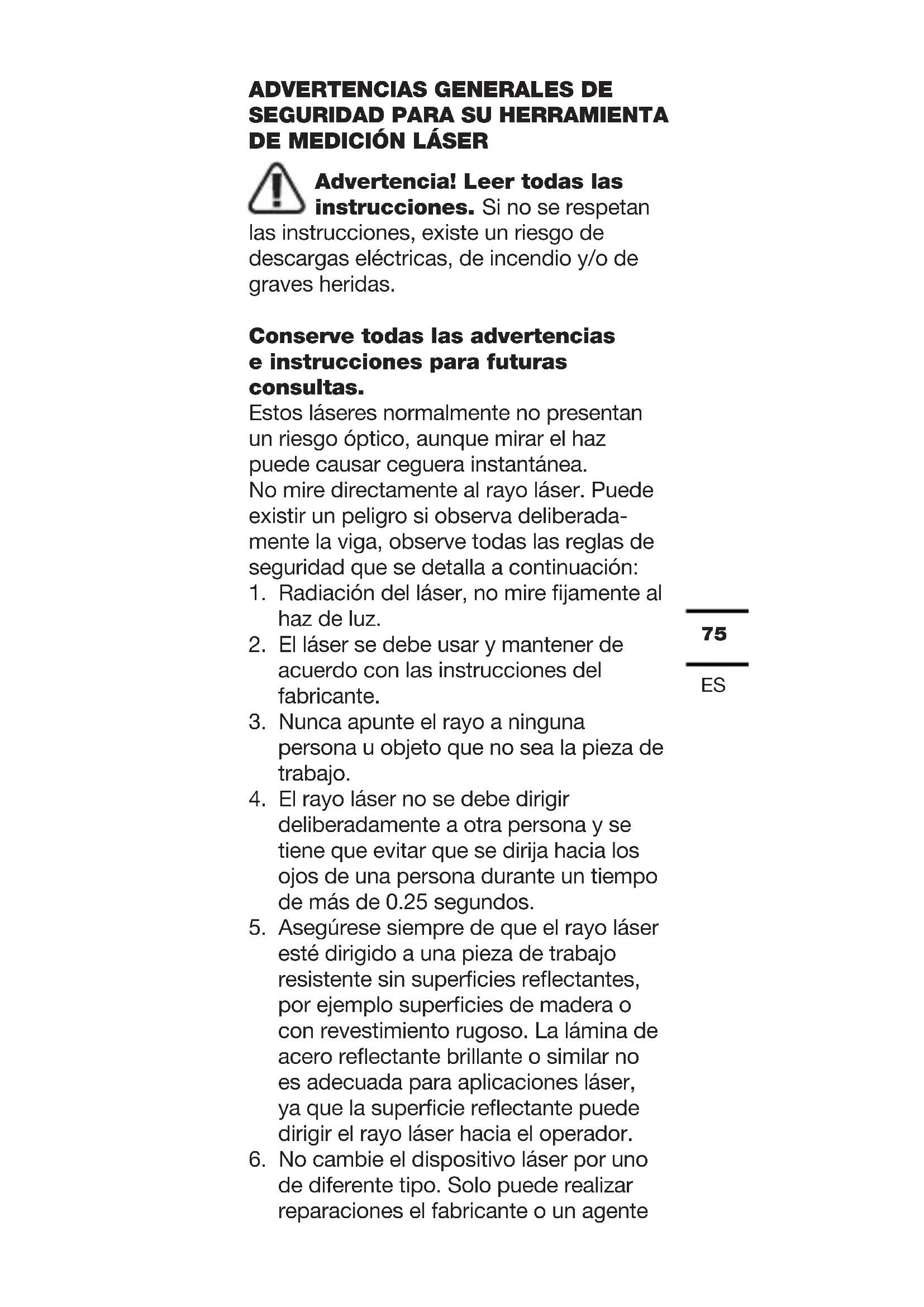 Advertencia! Leer todas las instrucciones. Si no se respetan las instrucciones, existe un riesgo de descargas eléctricas, de incendio y/o de graves heridas. Conserve todas las advertencias e instrucciones para futuras consultas. Estos láseres normalmente no presentan un riesgo óptico, aunque mirar el haz puede causar ceguera instantánea. No mire directamente al rayo láser. Puede existir un peligro si observa deliberada- mente la viga, observe todas las reglas de seguridad que se detalla a continuación: