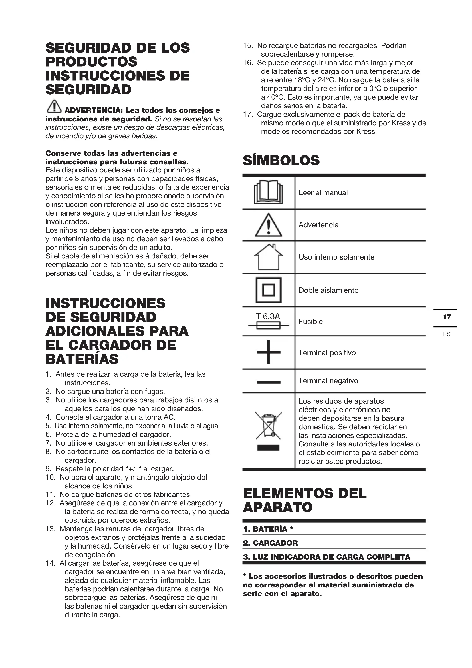 mismo modelo que el suministrado por Kress y de modelos recomendados por Kress. SÍMBOLOS Leer el manual Advertencia Uso interno solamente Doble aislamiento T 6.3A Fusible Terminal positivo Terminal negativo Los residuos de aparatos eléctricos y electrónicos no deben depositarse en la basura doméstica. Se deben reciclar en las instalaciones especializadas. Consulte a las autoridades locales o el establecimiento para saber cómo reciclar estos productos. ELEMENTOS DEL APARATO