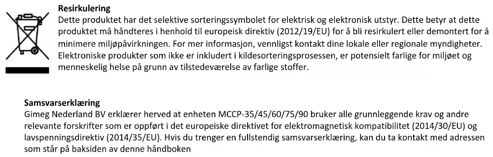 - Absorba el agua líquida o drene a través del tapón.Reciclaje Este producto lleva el símbolo de clasificación selectiva para residuos de equipos eléctricos y electrónicos. Esto significa que este producto debe manipularse de acuerdo con la Directiva europea (2012/19/EU) para su reciclaje y desmontaje, minimizando así su impacto en el medio ambiente. Para obtener más información, póngase en contacto con las autoridades locales o regionales. Los productos electrónicos no incluidos en el proceso de clasificación selectiva son potencialmente peligrosos para el medio ambiente y la salud humana debido a la presencia de sustancias peligrosas. Declaración de conformidad Por la presente, Gimeg Nederland B.V. declara que el dispositivo MCCP-35/45/60/75/90 cumple todos los requisitos básicos y otras regulaciones relevantes enumeradas en la directiva europea de compatibilidad electromagnética (2014/30/EU) y la directiva de baja tensión (2014/35/EU). Si necesita una declaración de conformidad completa, puede comunicarse con la dirección que figura en la parte posterior de este manual.SVENSKA Egenskaper