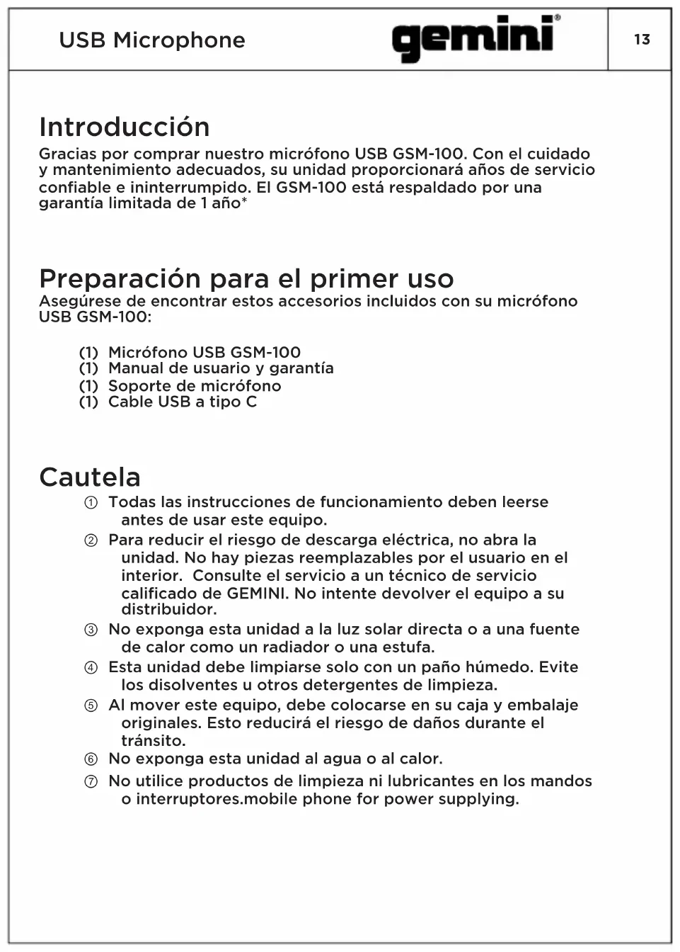 Gracias por comprar nuestro micrófono USB GSM-100. Con el cuidado y mantenimiento adecuados, su unidad proporcionará años de servicio confiable e ininterrumpido. El GSM-100 está respaldado por una garantía limitada de 1 año* Preparación para el primer uso Asegúrese de encontrar estos accesorios incluidos con su micrófono USB GSM-100: (1) Micrófono USB GSM-100 (1) Manual de usuario y garantía (1) Soporte de micrófono (1) Cable USB a tipo C Cautela ① Todas las instrucciones de funcionamiento deben leerse antes de usar este equipo. ② Para reducir el riesgo de descarga eléctrica, no abra la unidad. No hay piezas reemplazables por el usuario en el interior. Consulte el servicio a un técnico de servicio calificado de GEMINI. No intente devolver el equipo a su distribuidor. ③ No exponga esta unidad a la luz solar directa o a una fuente de calor como un radiador o una estufa. ④ Esta unidad debe limpiarse solo con un paño húmedo. Evite los disolventes u otros detergentes de limpieza. ⑤ Al mover este equipo, debe colocarse en su caja y embalaje originales. Esto reducirá el riesgo de daños durante el tránsito. ⑥ No exponga esta unidad al agua o al calor. ⑦ No utilice productos de limpieza ni lubricantes en los mandos o interruptores.mobile phone for power supplying. IntroducciónUSB Microphone