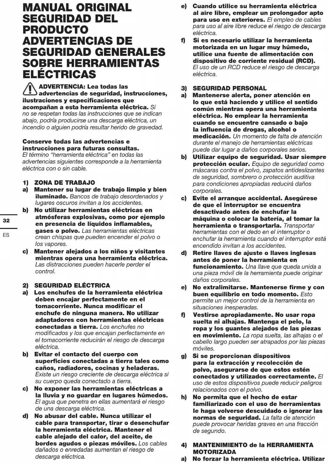 MANUAL ORIGINAL SEGURIDAD DEL PRODUCTO ADVERTENCIAS DE SEGURIDAD GENERALES SOBRE HERRAMIENTAS ELÉCTRICAS ADVERTENCIA: Lea todas las advertencias de seguridad, instrucciones, ilustraciones y especificaciones que acompañan a esta herramienta eléctrica. Si no se respetan todas las instrucciones que se indican abajo, podría producirse una descarga eléctrica, un incendio o alguien podría resultar herido de gravedad. Conserve todas las advertencias e instrucciones para futuras consultas. El término “herramienta eléctrica” en todas las advertencias siguientes corresponde a la herramienta eléctrica con o sin cable.