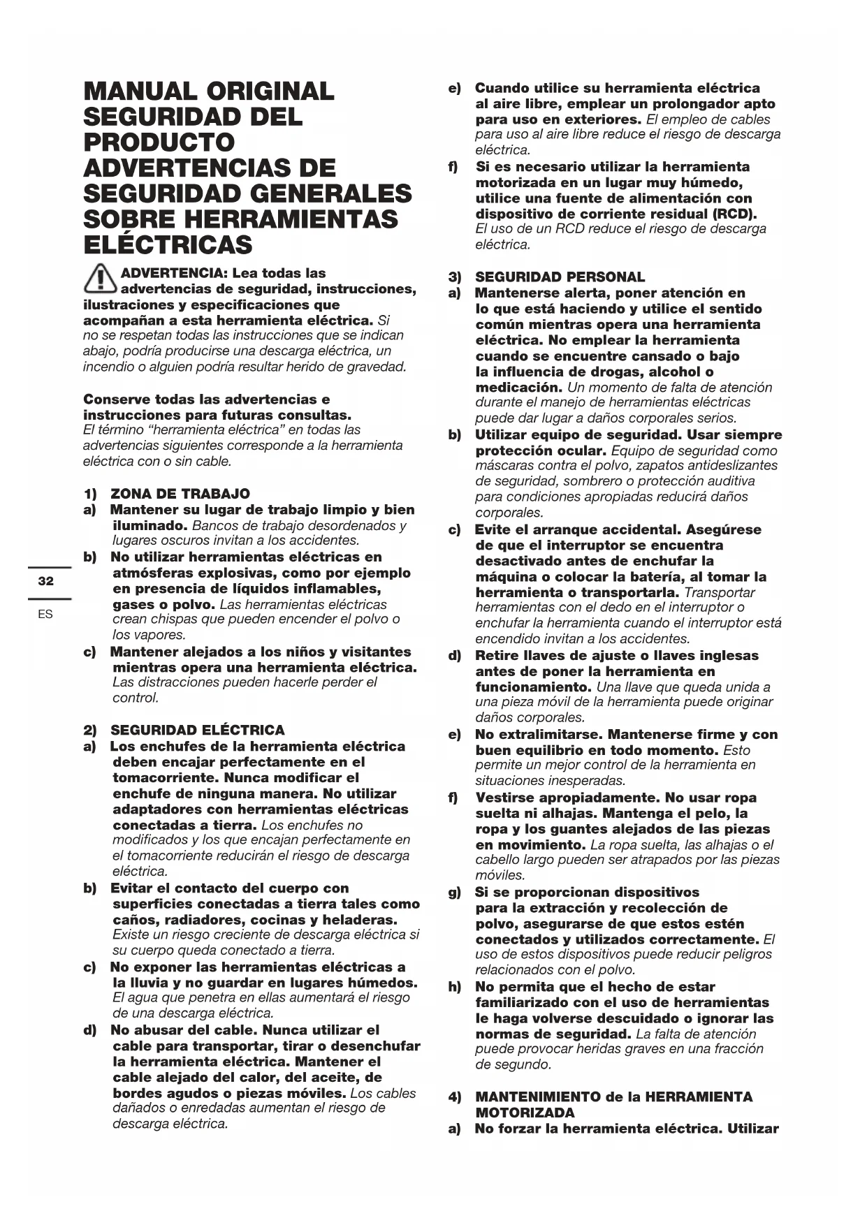 MANUAL ORIGINAL SEGURIDAD DEL PRODUCTO ADVERTENCIAS DE SEGURIDAD GENERALES SOBRE HERRAMIENTAS ELÉCTRICAS ADVERTENCIA: Lea todas las advertencias de seguridad, instrucciones, ilustraciones y especificaciones que acompañan a esta herramienta eléctrica. Si no se respetan todas las instrucciones que se indican abajo, podría producirse una descarga eléctrica, un incendio o alguien podría resultar herido de gravedad. Conserve todas las advertencias e instrucciones para futuras consultas. El término “herramienta eléctrica” en todas las advertencias siguientes corresponde a la herramienta eléctrica con o sin cable.