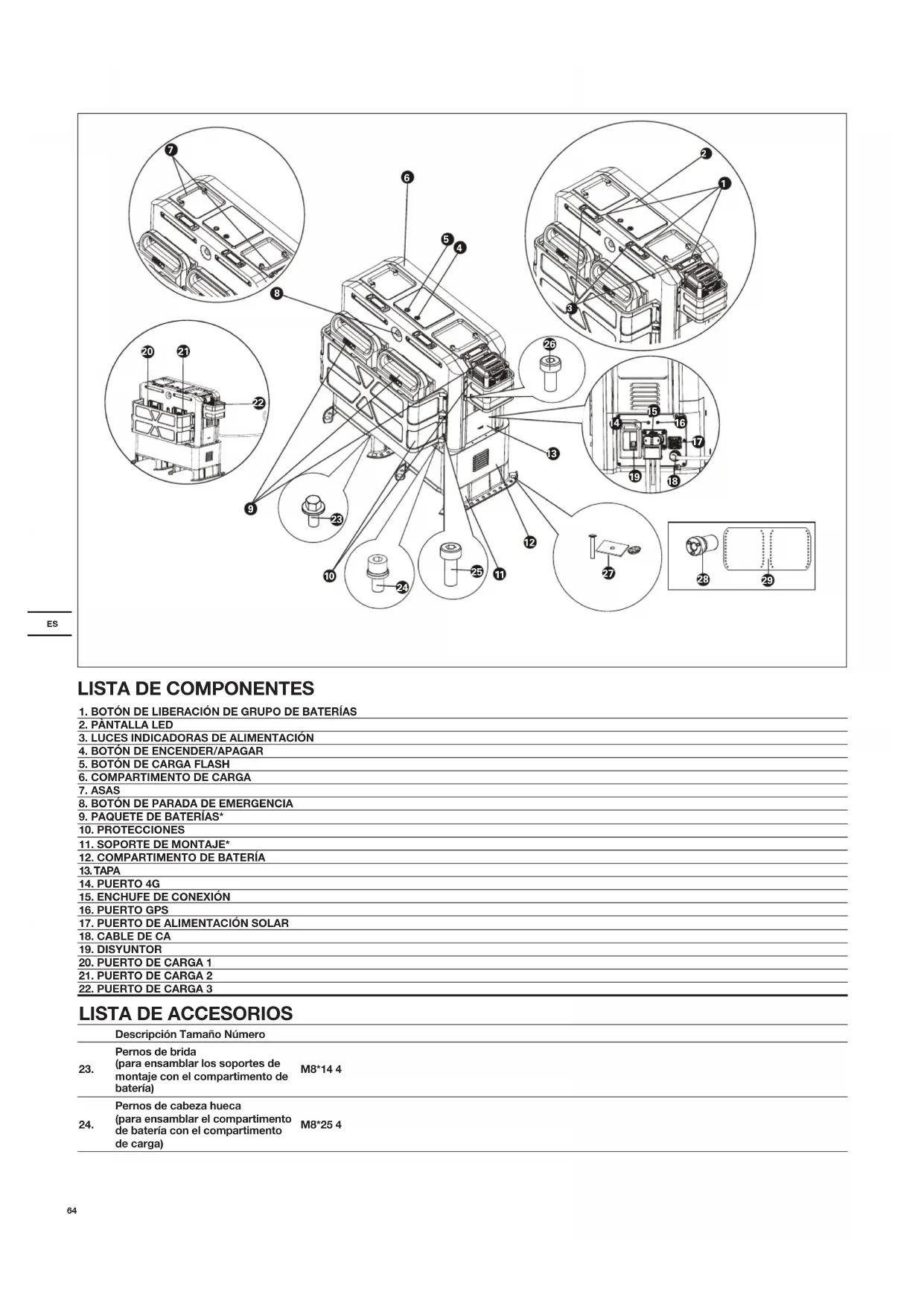 ADVERTENCIA - Cuando se use este producto se deben seguir siempre las precauciones básicas de seguridad, incluidas las siguientes: a) para reducir el riesgo de lesiones, es necesaria una estrecha supervisión cuando el producto se utiliza cerca de niños. b) El uso de un accesorio no recomendado o vendido por el fabricante del compartimento de bateríapuede terminar en un riesgo de incendio, descarga eléctrica o lesiones a las personas. c) No utilice un baterías o un aparato que esté dañado o modicado. Las baterías dañadas o modicadas pueden comportarse de forma impredecible y provocar incendios, explosiónes o riesgo de lesiones. d) No desmonte el compartimento de batería, llévelo a un técnico de servicio cualicado cuando necesite servicio o reparación. Un reensamblaje incorrecto puede tener como resultado riesgo de incendio o descarga eléctrica. e) ADVERTENCIA - RIESGO DE GASES EXPLOSIVOS. Para reducir el riesgo de explosión de la batería, siga estas instrucciones y las publicadas por el fabricante de la batería y el fabricante de cualquier equipo que desee utilizar cerca de la batería. Siga las instrucciones de uso del producto para evitar riesgos. f) Mantenga una buena ventilación para evitar excesiva acumulación de hidrógeno; g) No toque el electrolito de la batería, porque es corrosivo y perjudicial para los ojos y la piel. En caso de contacto con el electrolito, busque atención médica inmediatamente h) NUNCA fume ni permita la presencia de chispas o llamas cerca del compartimento de batería