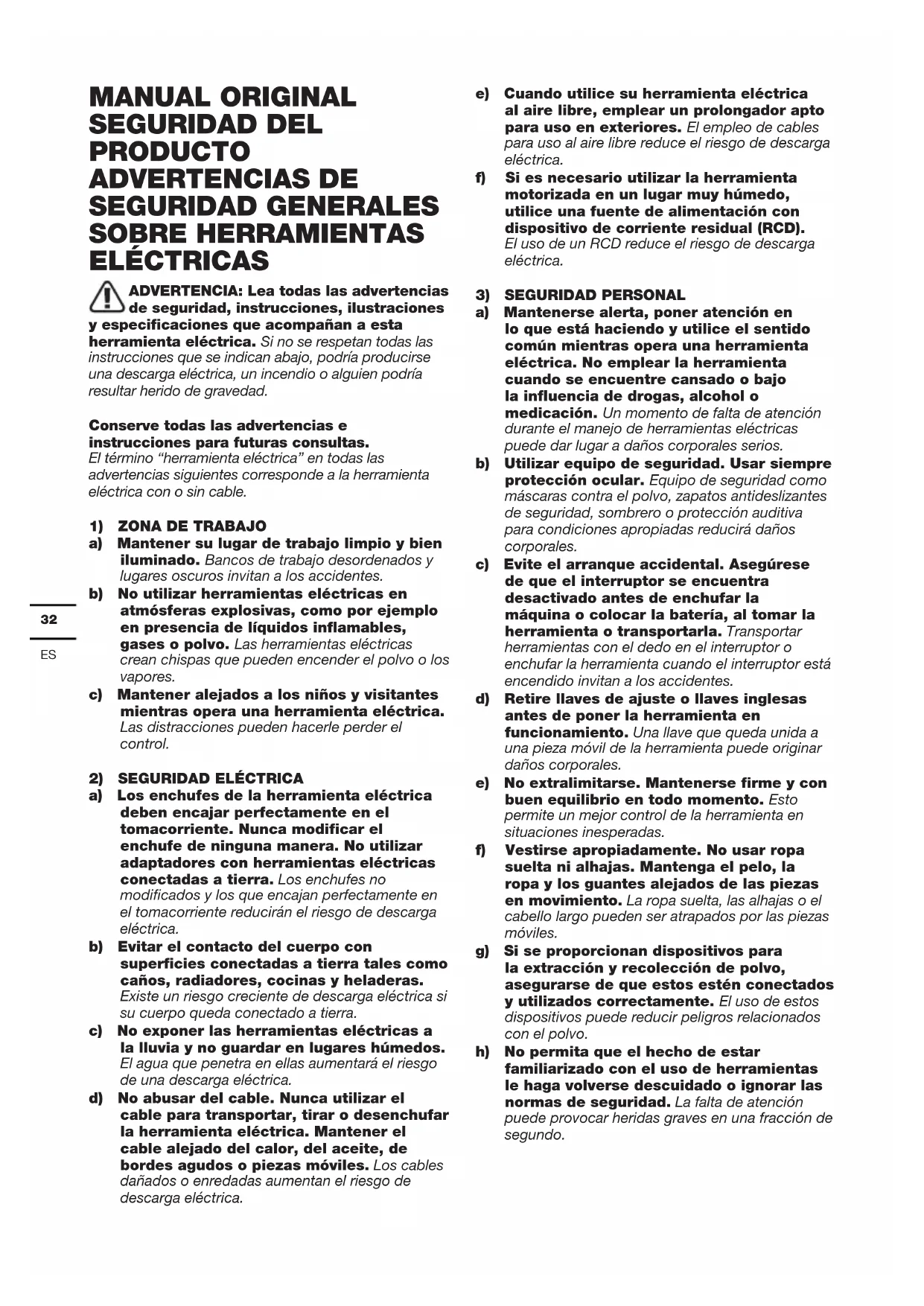 MANUAL ORIGINAL SEGURIDAD DEL PRODUCTO ADVERTENCIAS DE SEGURIDAD GENERALES SOBRE HERRAMIENTAS ELÉCTRICAS ADVERTENCIA: Lea todas las advertencias de seguridad, instrucciones, ilustraciones y especificaciones que acompañan a esta herramienta eléctrica. Si no se respetan todas las instrucciones que se indican abajo, podría producirse una descarga eléctrica, un incendio o alguien podría resultar herido de gravedad. Conserve todas las advertencias e instrucciones para futuras consultas. El término “herramienta eléctrica” en todas las advertencias siguientes corresponde a la herramienta eléctrica con o sin cable.