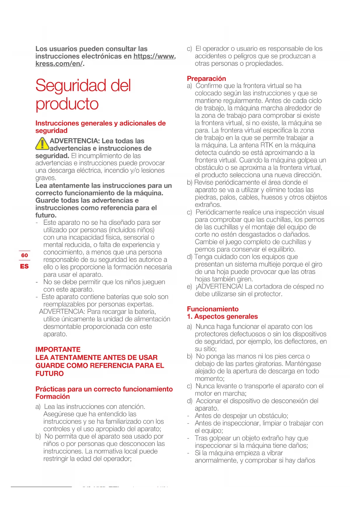 Los usuarios pueden consultar las instrucciones electrónicas en https://www. kress.com/en/. Seguridad del producto Instrucciones generales y adicionales de seguridad ADVERTENCIA: Lea todas las advertencias e instrucciones de seguridad. El incumplimiento de las advertencias e instrucciones puede provocar una descarga eléctrica, incendio y/o lesiones graves. Lea atentamente las instrucciones para un correcto funcionamiento de la máquina. Guarde todas las advertencias e instrucciones como referencia para el futuro. - Este aparato no se ha diseñado para ser utilizado por personas (incluidos niños) con una incapacidad física, sensorial o mental reducida, o falta de experiencia y conocimiento, a menos que una persona responsable de su seguridad les autorice a ello o les proporcione la formación necesaria para usar el aparato. - No se debe permitir que los niños jueguen con este aparato. - Este aparato contiene baterías que solo son reemplazables por personas expertas. ADVERTENCIA: Para recargar la batería, utilice únicamente la unidad de alimentación desmontable proporcionada con este aparato. IMPORTANTE