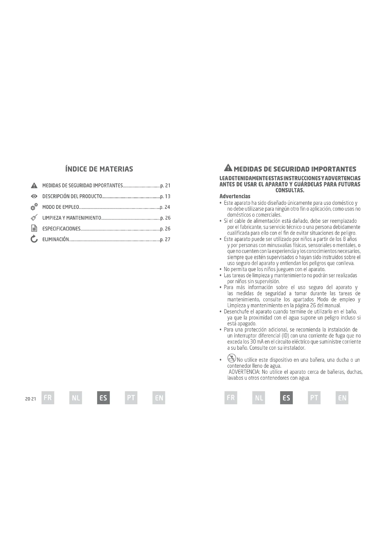 - Desenchufe el aparato cuando termine de utilizarlo en el baño, ya que la proximidad con el agua supone un peligro incluso si está apagado.