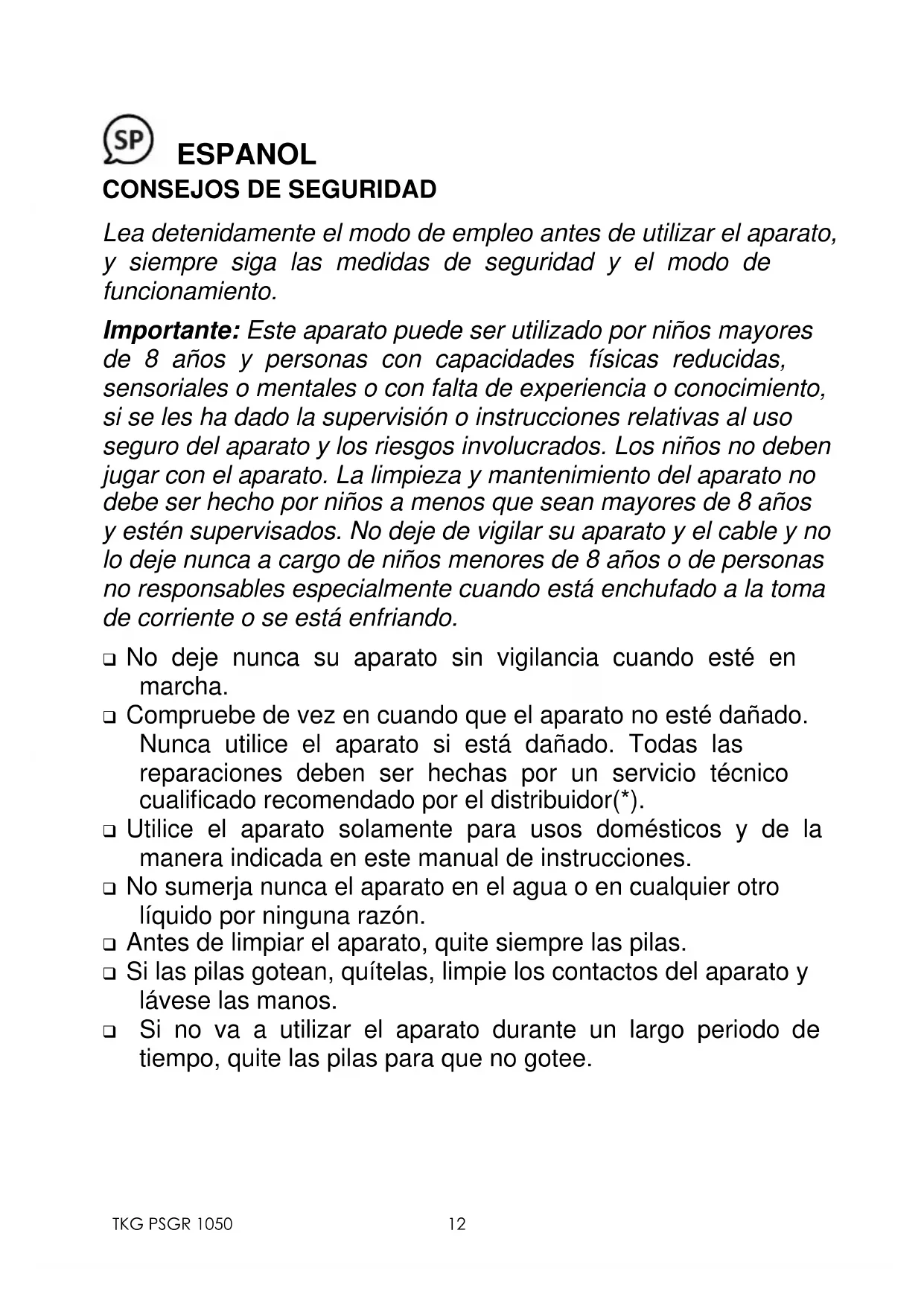 Lea detenidamente el modo de empleo antes de utilizar el aparato, y siempre siga las medidas de seguridad y el modo de funcionamiento. Importante: Este aparato puede ser utilizado por niños mayores de 8 años y personas con capacidades físicas reducidas, sensoriales o mentales o con falta de experiencia o conocimiento, si se les ha dado la supervisión o instrucciones relativas al uso seguro del aparato y los riesgos involucrados. Los niños no deben jugar con el aparato. La limpieza y mantenimiento del aparato no debe ser hecho por niños a menos que sean mayores de 8 años y estén supervisados. No deje de vigilar su aparato y el cable y no lo deje nunca a cargo de niños menores de 8 años o de personas no responsables especialmente cuando está enchufado a la toma de corriente o se está enfriando. ❑ No deje nunca su aparato sin vigilancia cuando esté en marcha. ❑ Compruebe de vez en cuando que el aparato no esté dañado. Nunca utilice el aparato si está dañado. Todas las reparaciones deben ser hechas por un servicio técnico cualificado recomendado por el distribuidor(*). ❑ Utilice el aparato solamente para usos domésticos y de la manera indicada en este manual de instrucciones. ❑ No sumerja nunca el aparato en el agua o en cualquier otro líquido por ninguna razón. ❑ Antes de limpiar el aparato, quite siempre las pilas. ❑ Si las pilas gotean, quítelas, limpie los contactos del aparato y lávese las manos. ❑ Si no va a utilizar el aparato durante un largo periodo de tiempo, quite las pilas para que no gotee.13 TKG PSGR 1050