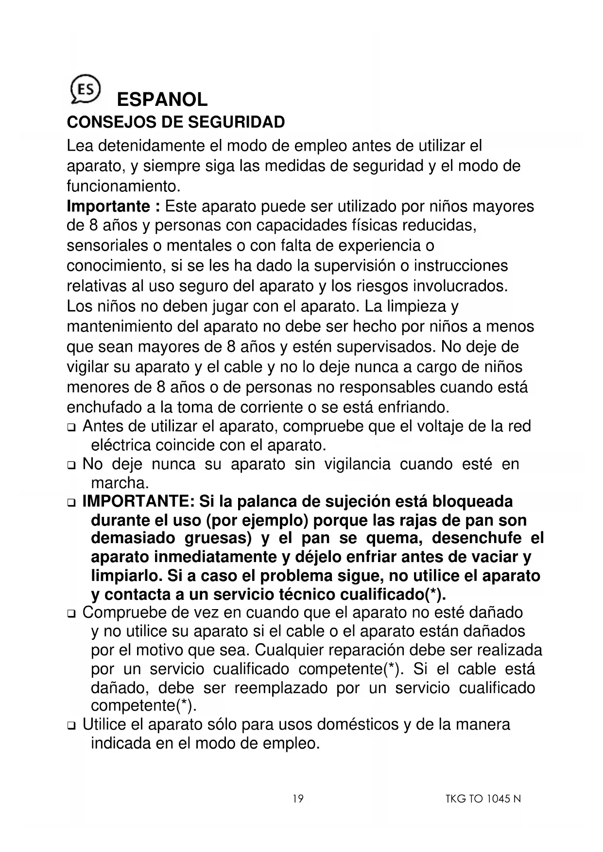 Lea detenidamente el modo de empleo antes de utilizar el aparato, y siempre siga las medidas de seguridad y el modo de funcionamiento. Importante : Este aparato puede ser utilizado por niños mayores de 8 años y personas con capacidades físicas reducidas, sensoriales o mentales o con falta de experiencia o conocimiento, si se les ha dado la supervisión o instrucciones relativas al uso seguro del aparato y los riesgos involucrados. Los niños no deben jugar con el aparato. La limpieza y mantenimiento del aparato no debe ser hecho por niños a menos que sean mayores de 8 años y estén supervisados. No deje de vigilar su aparato y el cable y no lo deje nunca a cargo de niños menores de 8 años o de personas no responsables cuando está enchufado a la toma de corriente o se está enfriando. ❑ Antes de utilizar el aparato, compruebe que el voltaje de la red eléctrica coincide con el aparato. ❑ No deje nunca su aparato sin vigilancia cuando esté en marcha. ❑ IMPORTANTE: Si la palanca de sujeción está bloqueada durante el uso (por ejemplo) porque las rajas de pan son demasiado gruesas) y el pan se quema, desenchufe el aparato inmediatamente y déjelo enfriar antes de vaciar y limpiarlo. Si a caso el problema sigue, no utilice el aparato y contacta a un servicio técnico cualificado(*). ❑ Compruebe de vez en cuando que el aparato no esté dañado y no utilice su aparato si el cable o el aparato están dañados por el motivo que sea. Cualquier reparación debe ser realizada por un servicio cualificado competente(*). Si el cable está dañado, debe ser reemplazado por un servicio cualificado competente(*). ❑ Utilice el aparato sólo para usos domésticos y de la manera indicada en el modo de empleo.TKG TO 1045 N