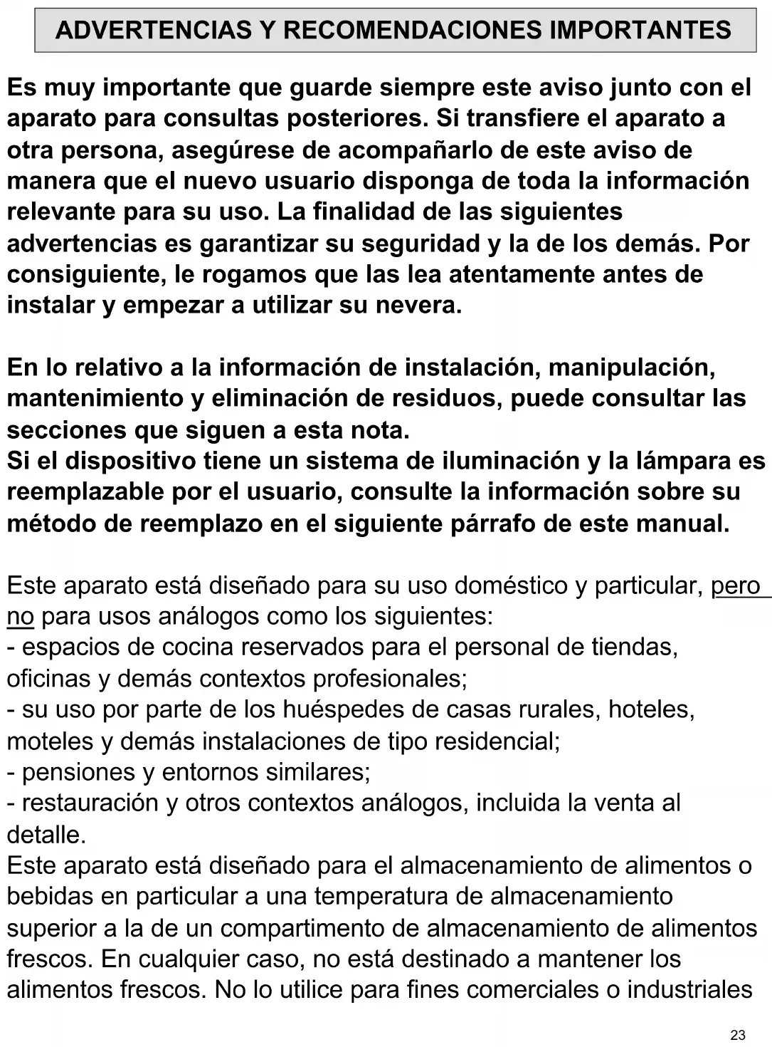 Es muy importante que guarde siempre este aviso junto con el aparato para consultas posteriores. Si transfiere el aparato a otra persona, asegúrese de acompañarlo de este aviso de manera que el nuevo usuario disponga de toda la información relevante para su uso. La finalidad de las siguientes advertencias es garantizar su seguridad y la de los demás. Por consiguiente, le rogamos que las lea atentamente antes de instalar y empezar a utilizar su nevera. En lo relativo a la información de instalación, manipulación, mantenimiento y eliminación de residuos, puede consultar las secciones que siguen a esta nota. Si el dispositivo tiene un sistema de iluminación y la lámpara es reemplazable por el usuario, consulte la información sobre su método de reemplazo en el siguiente párrafo de este manual. Este aparato está diseñado para su uso doméstico y particular, pero no para usos análogos como los siguientes: - espacios de cocina reservados para el personal de tiendas, oficinas y demás contextos profesionales; - su uso por parte de los huéspedes de casas rurales, hoteles, moteles y demás instalaciones de tipo residencial; - pensiones y entornos similares; - restauración y otros contextos análogos, incluida la venta al detalle. Este aparato está diseñado para el almacenamiento de alimentos o bebidas en particular a una temperatura de almacenamiento superior a la de un compartimento de almacenamiento de alimentos frescos. En cualquier caso, no está destinado a mantener los alimentos frescos. No lo utilice para fines comerciales o industriales