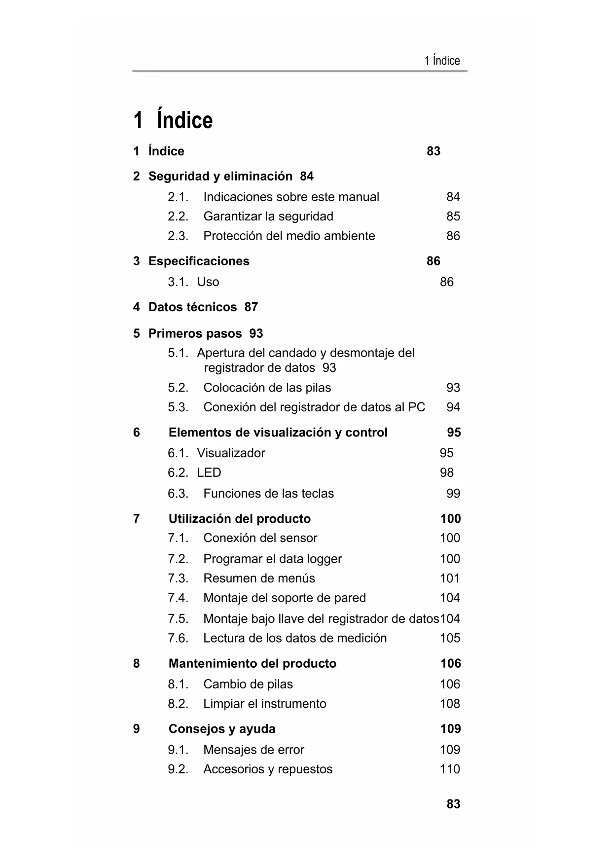 1 Índice 1 Índice 83 2 Seguridad y eliminación 84 2.1. Indicaciones sobre este manual 84 2.2. Garantizar la seguridad 85 2.3. Protección del medio ambiente 86 3 Especificaciones 86 3.1. Uso 86 4 Datos técnicos 87 5 Primeros pasos 93 5.1. Apertura del candado y desmontaje del registrador de datos 93 5.2. Colocación de las pilas 93 5.3. Conexión del registrador de datos al PC 94 6 Elementos de visualización y control 95 6.1. Visualizador 95 6.2. LED 98 6.3. Funciones de las teclas 99 7 Utilización del producto 100 7.1. Conexión del sensor 100 7.2. Programar el data logger 100 7.3. Resumen de menús 101 7.4. Montaje del soporte de pared 104 7.5. Montaje bajo llave del registrador de datos104 7.6. Lectura de los datos de medición 105 8 Mantenimiento del producto 106 8.1. Cambio de pilas 106 8.2. Limpiar el instrumento 108 9 Consejos y ayuda 109 9.1. Mensajes de error 109 9.2. Accesorios y repuestos 1102 Seguridad y eliminación