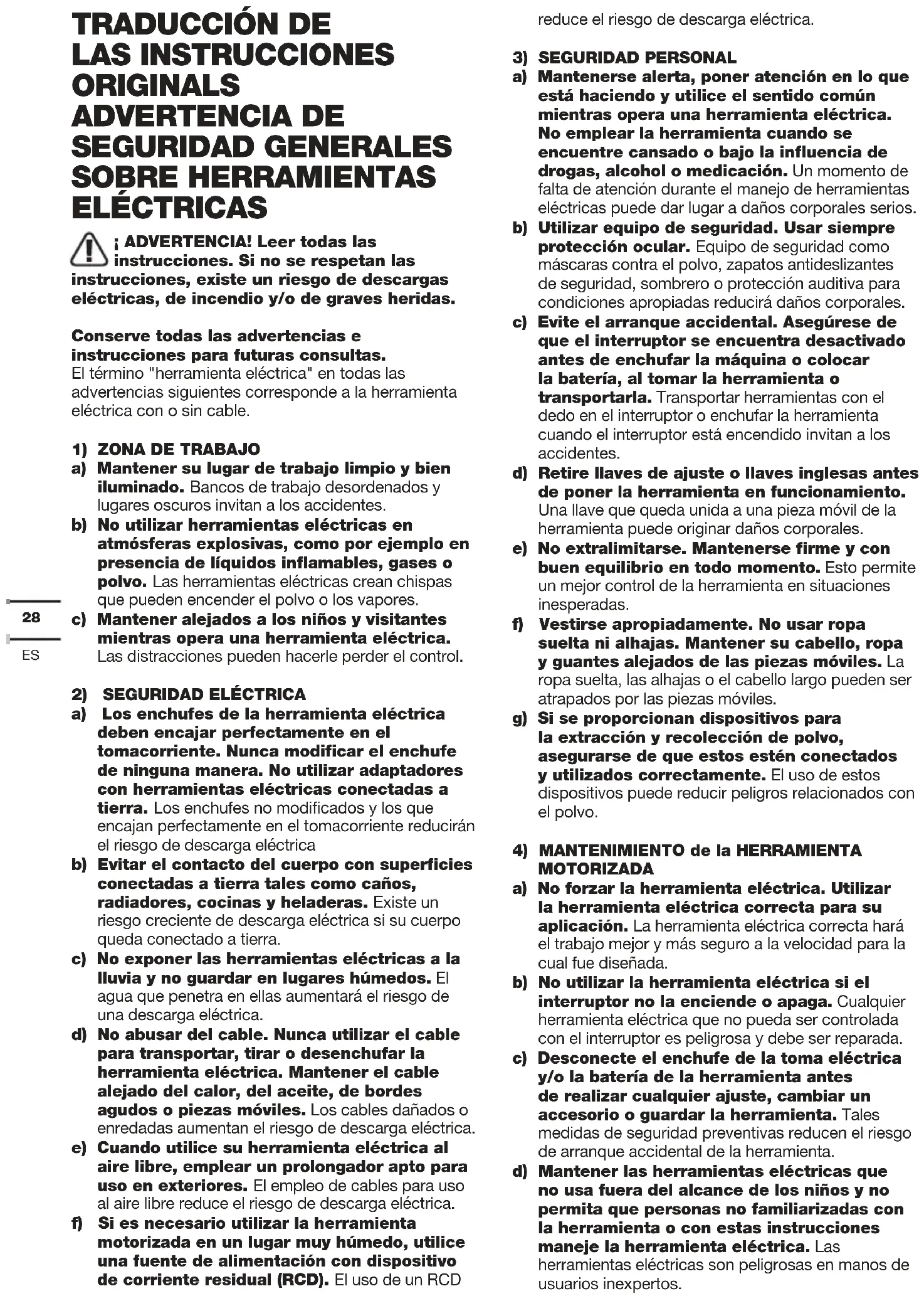 LAS INSTRUCCIONES ORIGINALS ADVERTENCIA DE SEGURIDAD GENERALES SOBRE HERRAMIENTAS ELÉCTRICAS ¡ ADVERTENCIA! Leer todas las instrucciones. Si no se respetan las instrucciones, existe un riesgo de descargas eléctricas, de incendio y/o de graves heridas. Conserve todas las advertencias e instrucciones para futuras consultas. El término "herramienta eléctrica" en todas las advertencias siguientes corresponde a la herramienta eléctrica con o sin cable.